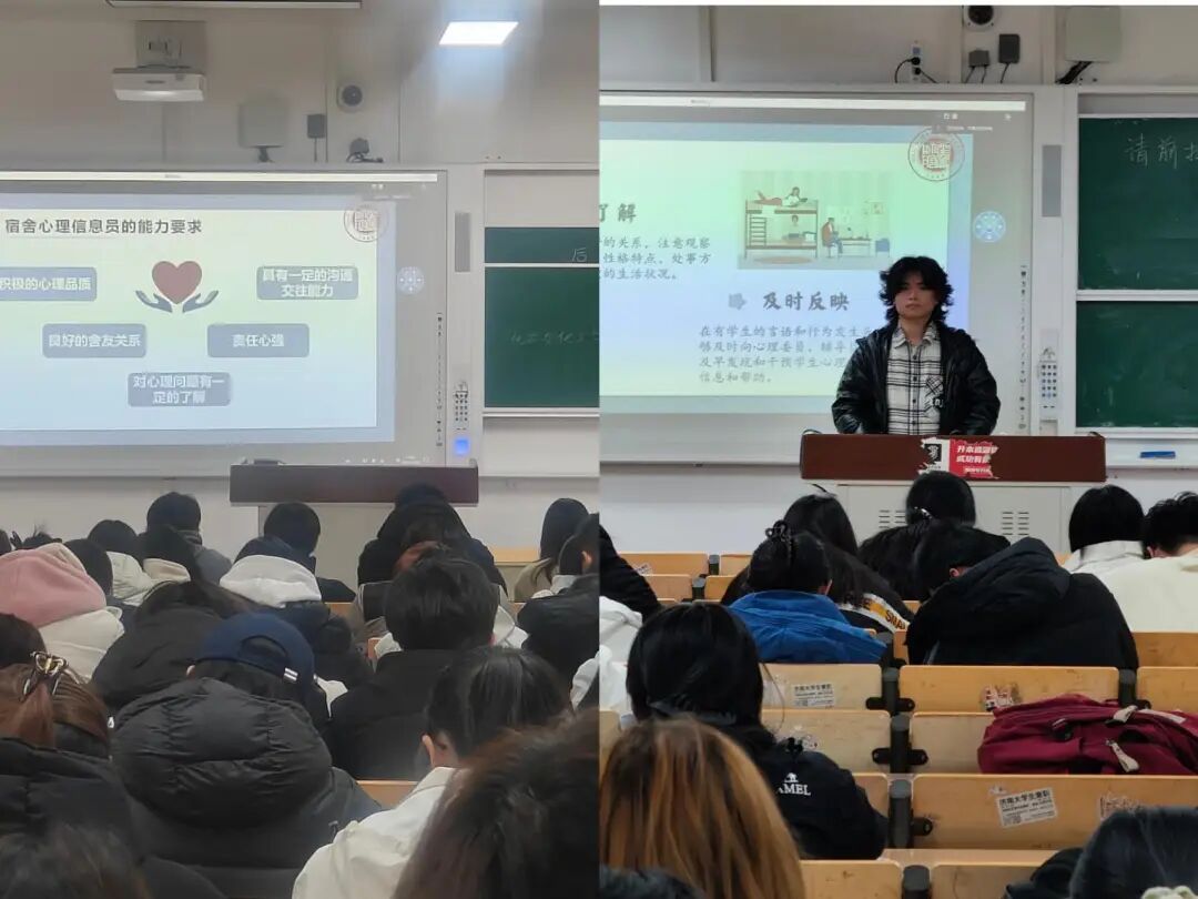 为筑牢校园心理健康防护网,提升宿舍心理信 息员心理危机的识别与其应对能力,充分发挥其桥梁与预警作用,11月24日晚,学校2025年宿舍心理信息员培训会议在图书馆第一学术报告厅如期举行。