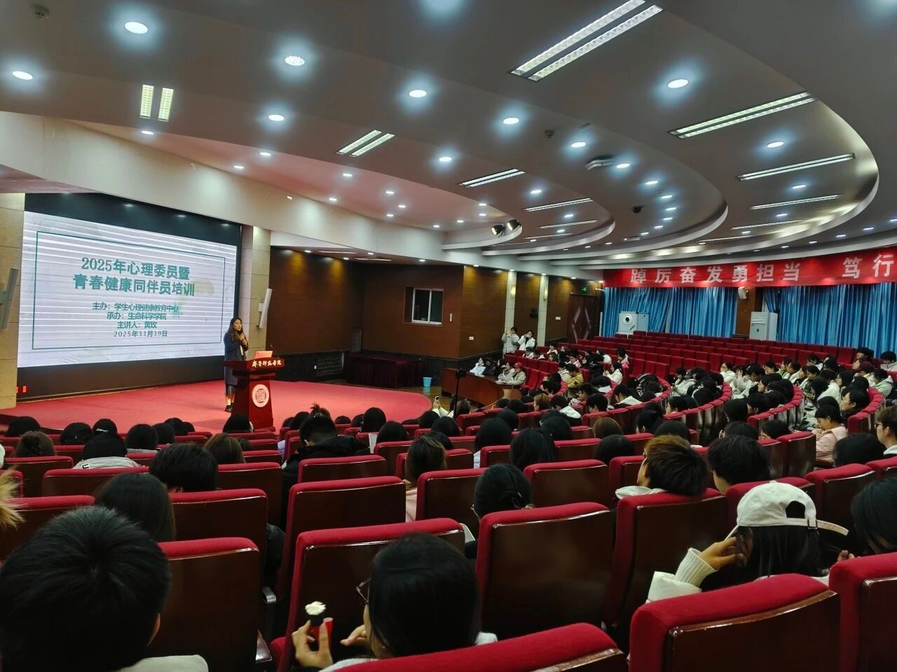 为加强学生心理委员队伍建设,提升其专业素养与履职能力,筑牢校园心理健康防护网,2025年11月19日晚,由学生工作部(处)学生心理健康教育中心主办、生命科学学院承办的2025年心理委员暨青春健康同伴员培训在章丘校区图书馆第一报告厅顺利举行。由心理老师黄玫担任主讲,各学院心理委员暨青春健康同伴员参与培训。