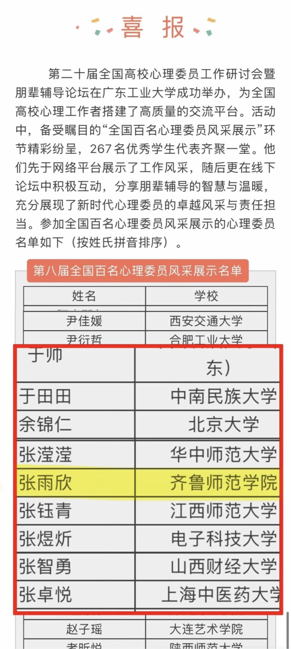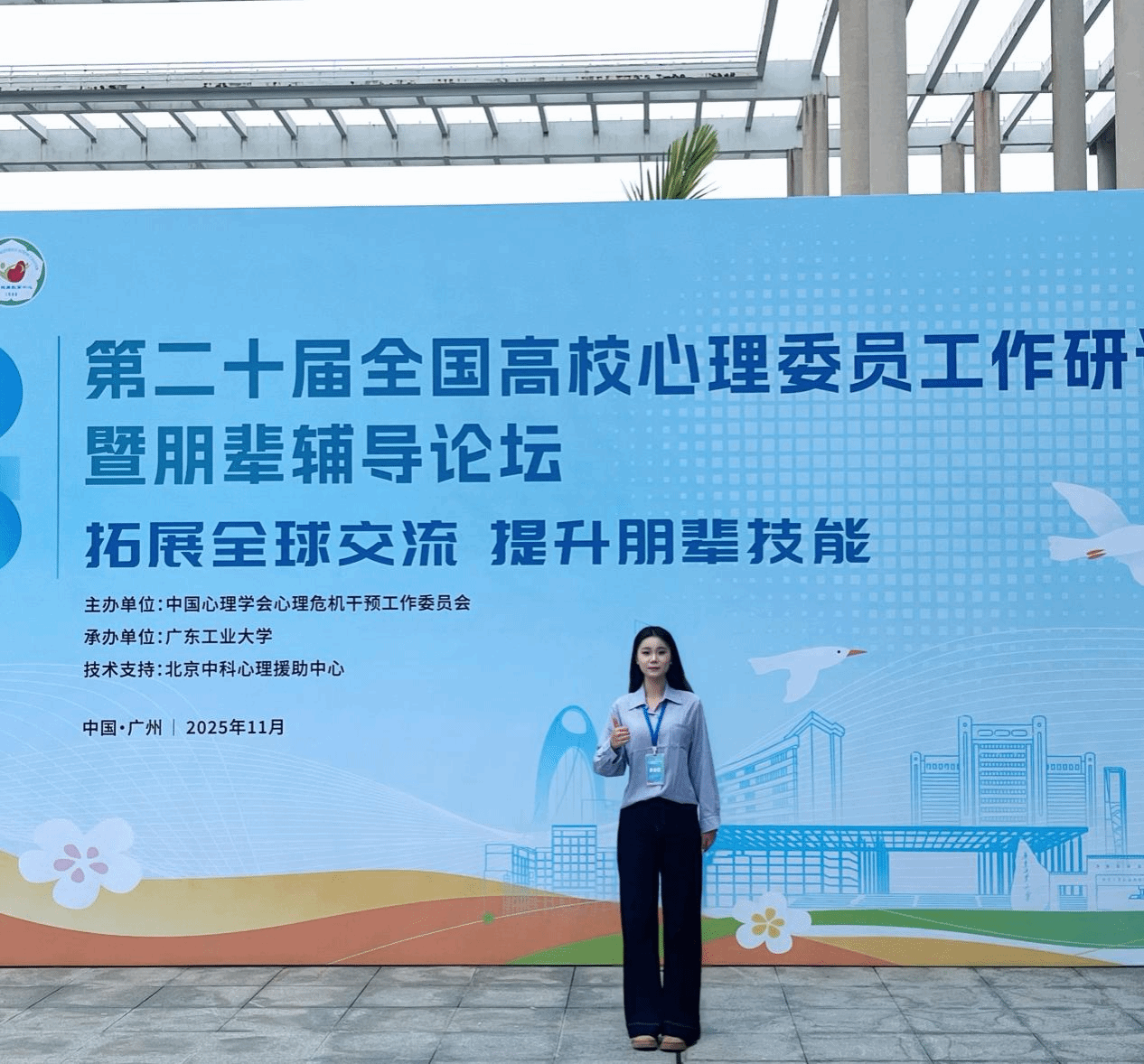 近日,由中国心理学会心理危机干预工作委员会主办、广东工业大学学生处承办的第二十届全国高校心理委员工作研讨会暨朋辈辅导论坛,于2025年11月5-7日在广东工业大学召开。我校2023级学前教育学院学生张雨欣成功入选2025年全国百名心理委员风采展。