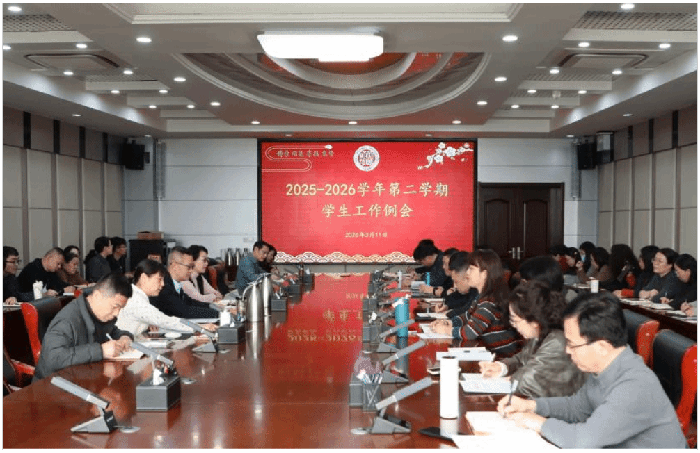 3月11日下午,学校在第一会议室召开2026年度学生工作例会。党委委员、副校长孙洪兆主持会议并讲话。党委委员、宣传部部长孙磊,学生工作处处长李玮,各学院党委书记、党委副书记、团总支书记及学生工作处全体人员参加会议。