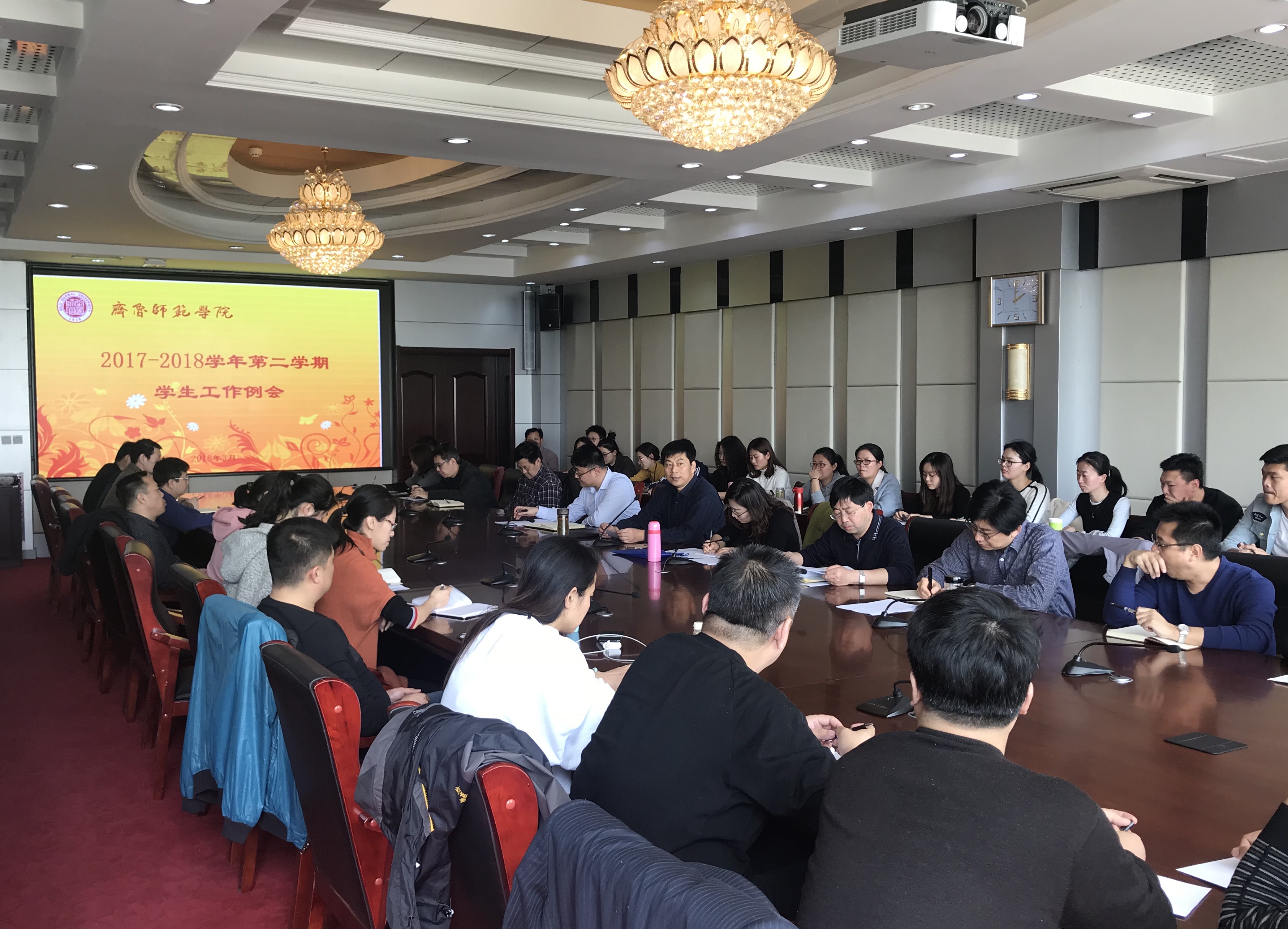 会上,学生工作处处长孙磊传达部署了2018年学生工作处重点工作,指出2018年学生工作处将围绕“强化学生教育,培育优良学风,提高服务质量,增强队伍素质”的总体思路,着重推进“学生思想引领”“优良学风培育”“就业服务提升”“队伍专业建设”四项工程,实施“阳光心灵”“学风引领”、就业“成长助力”、辅导员“分类培训”“科研提升”五项计划,进一步提升学生教育、管理和服务水平。团委书记孔庆松提出2018年团委工作将继续围绕强化思想引领、活跃校园文化等主题开展相关活动,充分发挥第二课堂作用,进一步营造良好校园文化氛围。学生工作处副处长郁志营传达了《中共山东省委组织部、山东省人力资源和社会保障厅关于做好2018年选调应届优秀高校毕业生到基层工作的通知》文件精神。