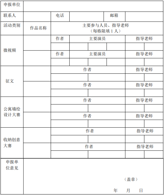 (2)微视频选用 MOV、AVI、MP4 等常用高清视频格式,分辨率不低于 1280*720(16:9),时长在 15 分钟以内,大小不超过 200MB。各学院填写《第十二届大学生宿舍文化节评选申报表》(见附件 1),参评作品电子版需于