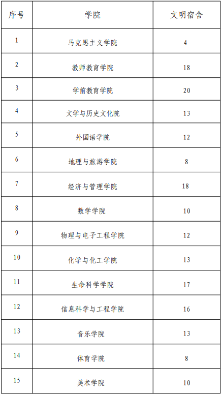 3.评选要求及注意事项:文明宿舍评选需满足宿舍成员学年内无违反公寓管理规定和其他校规校纪的要求,宿舍初评将重点结合学生宿舍的日常安全检查和宿舍舍员遵守校规校纪的情况。参与文明评选的宿舍需由各学院于 12 月 4 日前在本学院范围内对文明宿舍进行初评和推荐上报。经过初评推选出的宿舍,填写《文明宿舍申报审核表》(见附件4)并于 12 月 4 日前电子版交至学生管理中心邮箱 qlsfxsgy@163.com。12 月 5 日起将开展对推荐上报宿舍的校级检查评选工作。