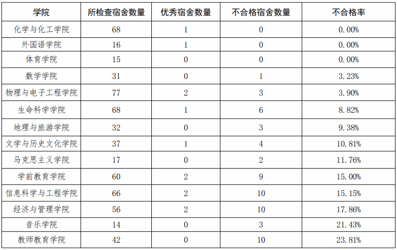在本周学生宿舍集中大检查中,学生管理中心按照《齐鲁师范学院学生公寓管理规定》《齐鲁师范学院学生公寓卫生管理标准实施细则》等文件要求,对章丘校区599间全体宿舍进行检查,评出优秀宿舍12间,不合格宿舍61间。