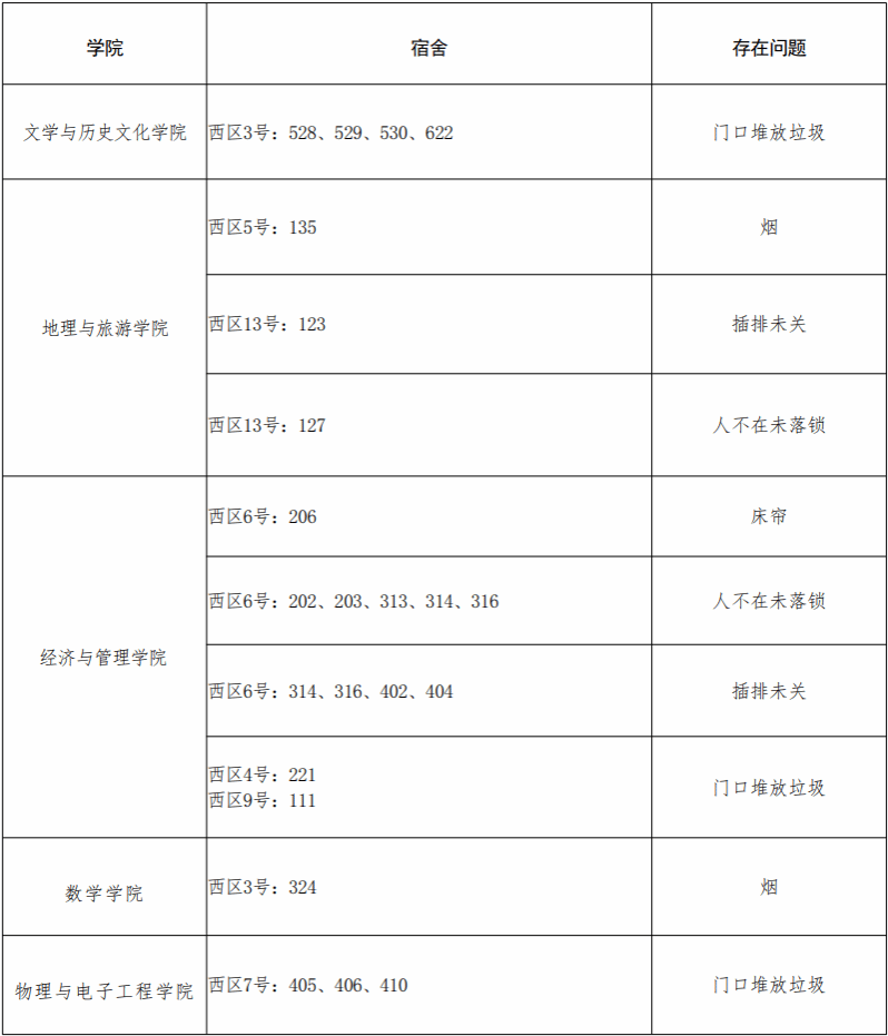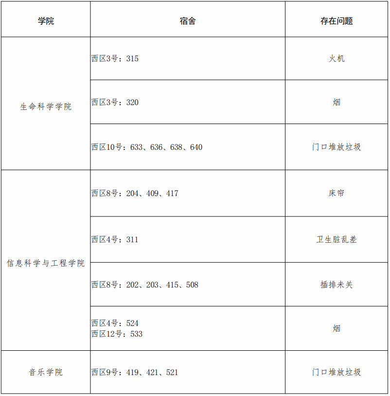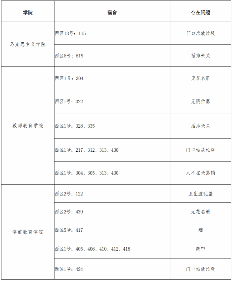 请各学院根据本周宿舍检查情况,认真整改,对问题宿舍学生进行严肃批评教育,对于学生违纪情况,落实好责任人并根据《齐鲁师范学院学生违纪处分规定》严肃处理,处理意见于 10 月 23 日下午 16:00 前交至学生工作部(处)学生管理中心报备。