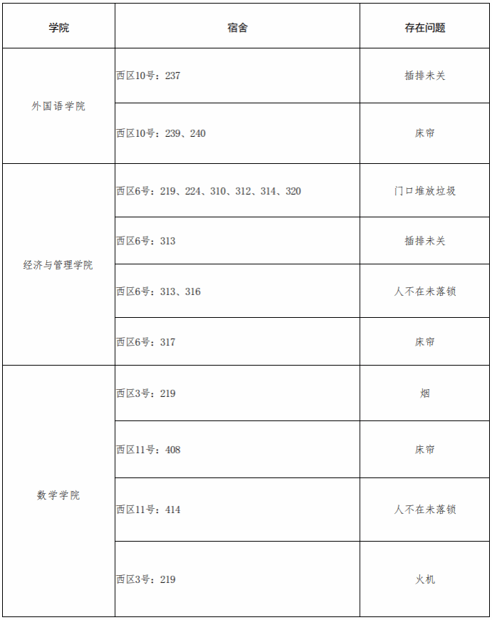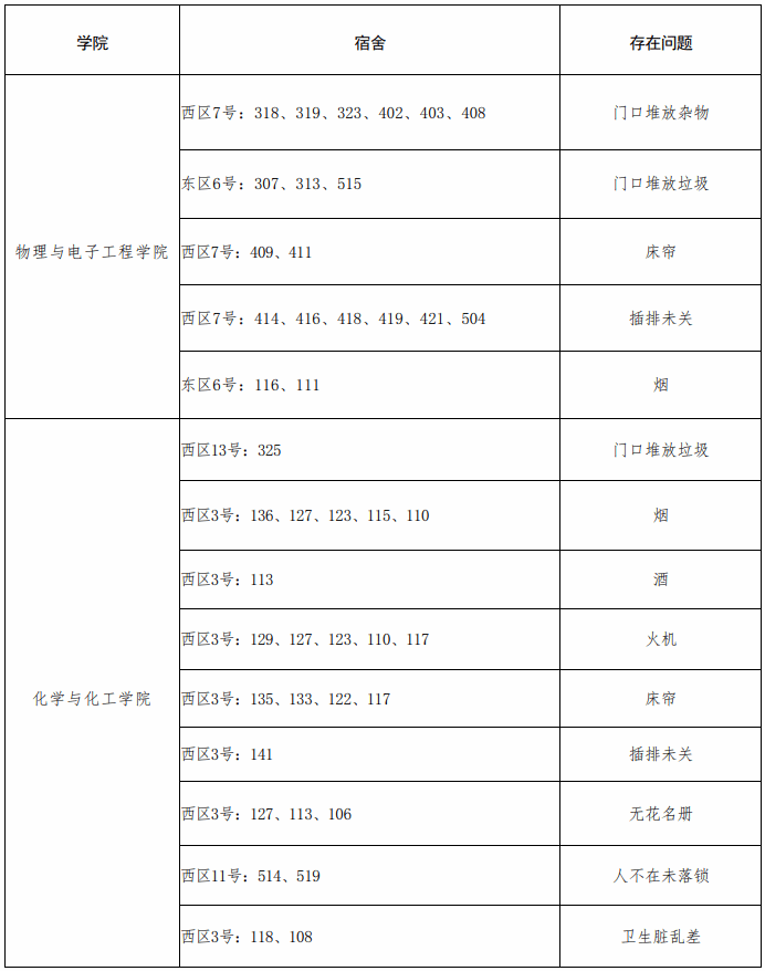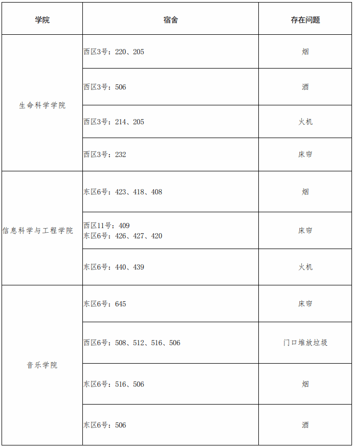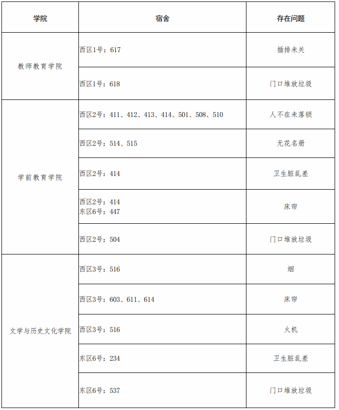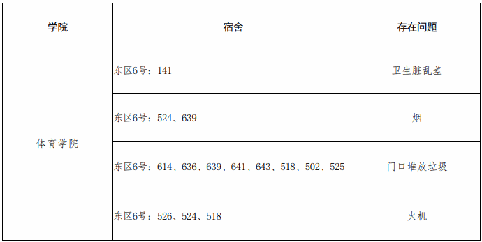 请各学院根据本周宿舍检查情况,认真整改,对问题宿舍学生进行严肃批评教育,对于学生违纪情况,落实好责任人并根据《齐鲁师范学院学生违纪处分规定》严肃处理,处理意见于 11 月 6 日下午 16:00 前交至学生工作部(处)学生管理中心报备。
