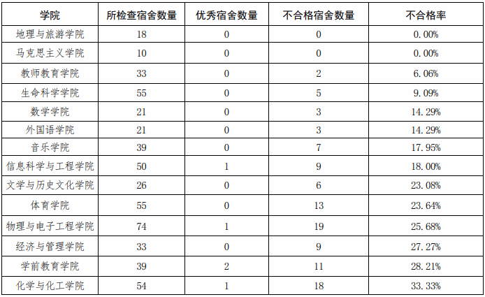 在本周学生宿舍集中大检查中,学生管理中心按照《齐鲁师范学院学生公寓管理规定》《齐鲁师范学院学生公寓卫生管理标准实施细则》等文件要求,对章丘校区528间宿舍进检查,评出优秀宿舍5间,不合格宿舍105间。
