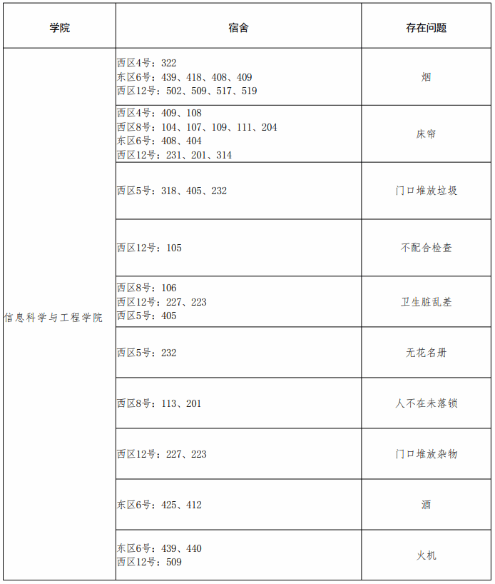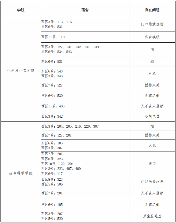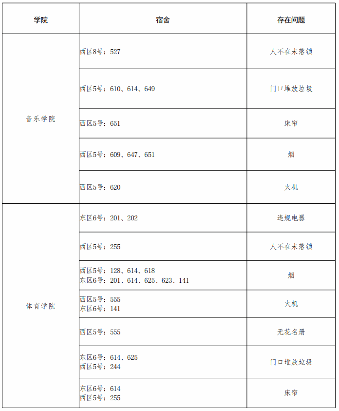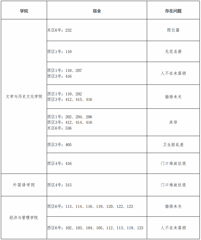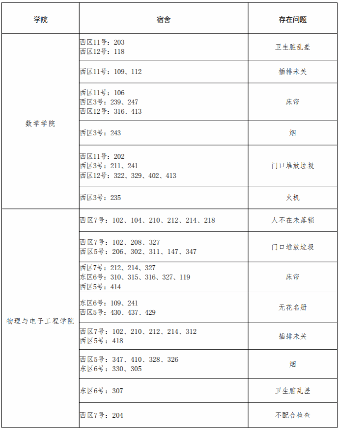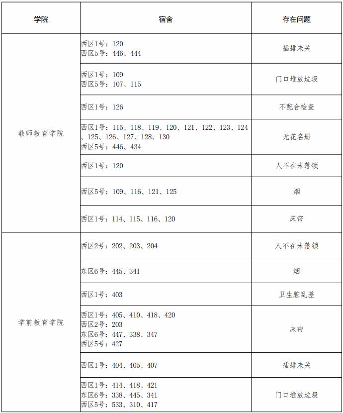 请各学院根据本周宿舍检查情况,认真整改,对问题宿舍学生进行严肃批评教育,对于学生违纪情况,落实好责任人并根据《齐鲁师范学院学生违纪处分规定》严肃处理,处理意见于 11 月 13 日下午 16:00 前交至学生工作部(处)学生管理中心报备。