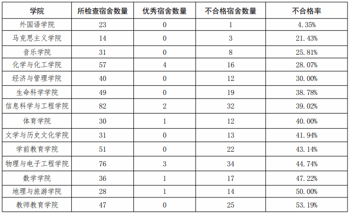 在本周学生宿舍集中大检查中,学生管理中心按照《齐鲁师范学院学生公寓管理规定》《齐鲁师范学院学生公寓卫生管理标准实施细则》等文件要求,对章丘校区595间宿舍进检查,评出优秀宿舍12间,不合格宿舍228间。