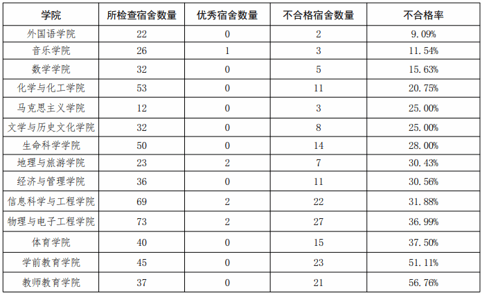 在本周学生宿舍集中大检查中,学生管理中心按照《齐鲁师范学院学生公寓管理规定》《齐鲁师范学院学生公寓卫生管理标准实施细则》等文件要求,对章丘校区550间宿舍进检查,评出优秀宿舍7间,不合格宿舍172间。