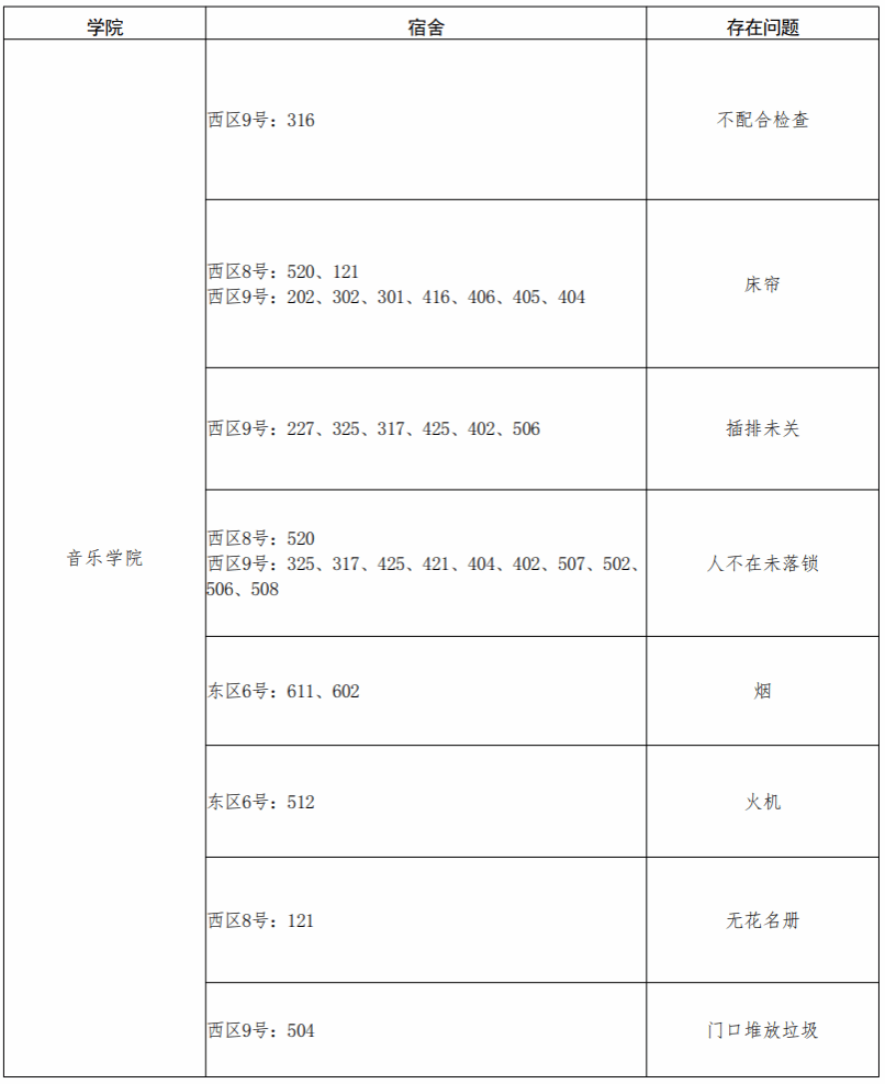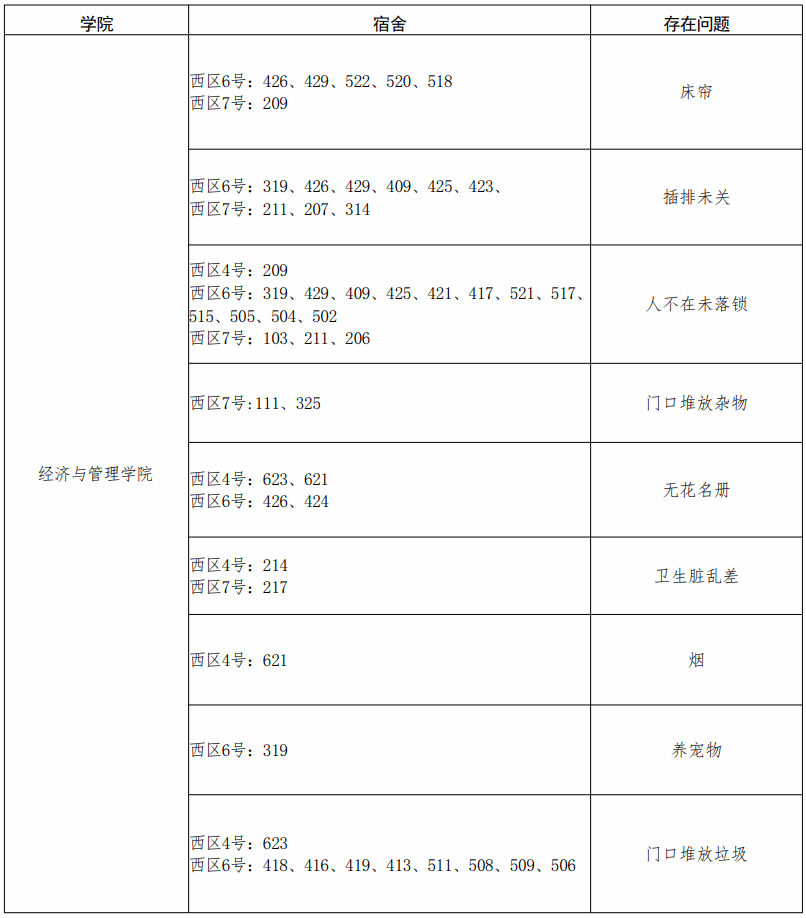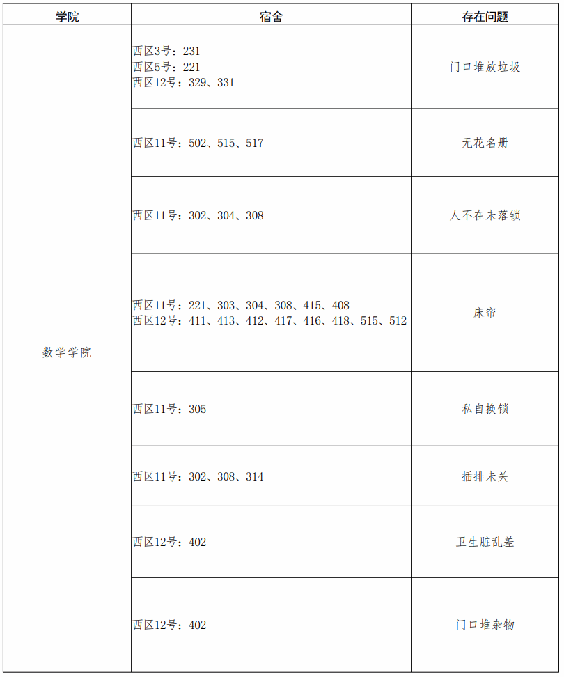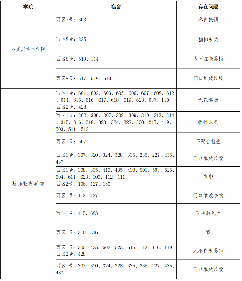 请各学院根据本周宿舍检查情况,认真整改,对问题宿舍学生进行严肃批评教育,对于学生违纪情况,落实好责任人并根据《齐鲁师范学院学生违纪处分规定》严肃处理,处理意见于 12 月 11 日下午 16:00 前交至学生工作部(处)学生管理中心报备。
