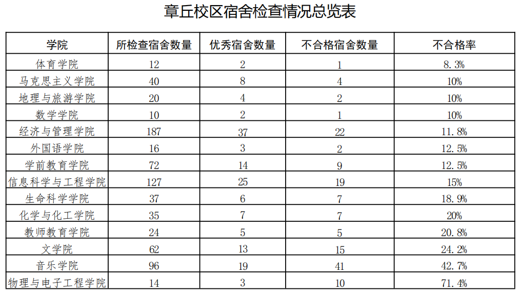在本周学生宿舍集中大检查中,学生公寓管理服务中心按照《齐鲁师范学院学生公寓管理规定》、《齐鲁师范学院学生公寓卫生管理标准实施细则》等文件要求 ,对章丘校区752间宿舍进行检查,评出优秀宿舍149间,不合格宿舍145间。现公告如下: