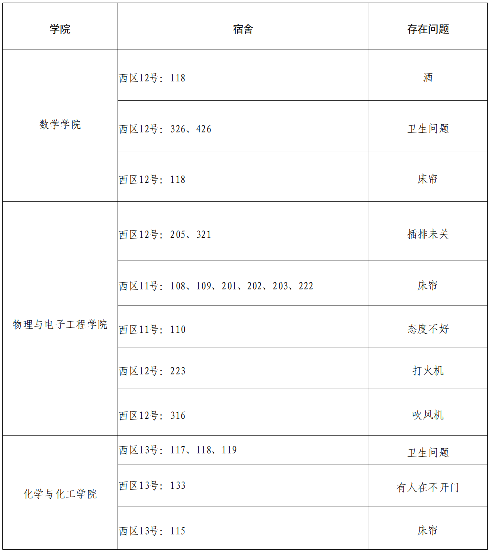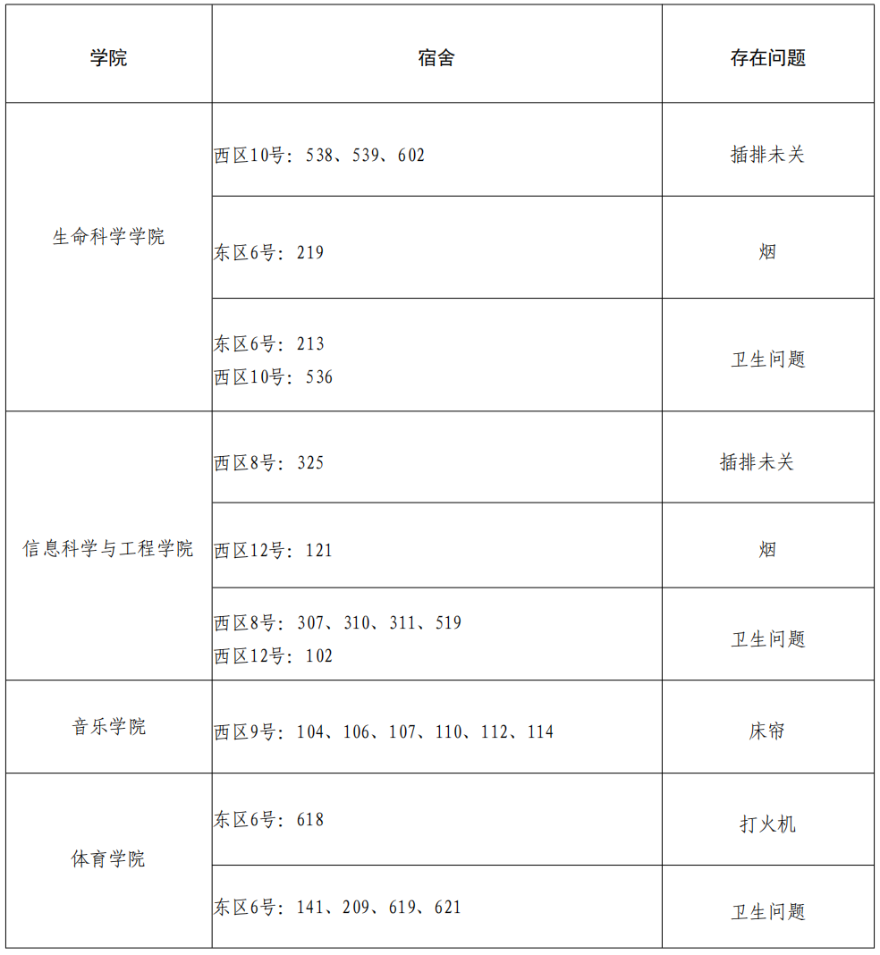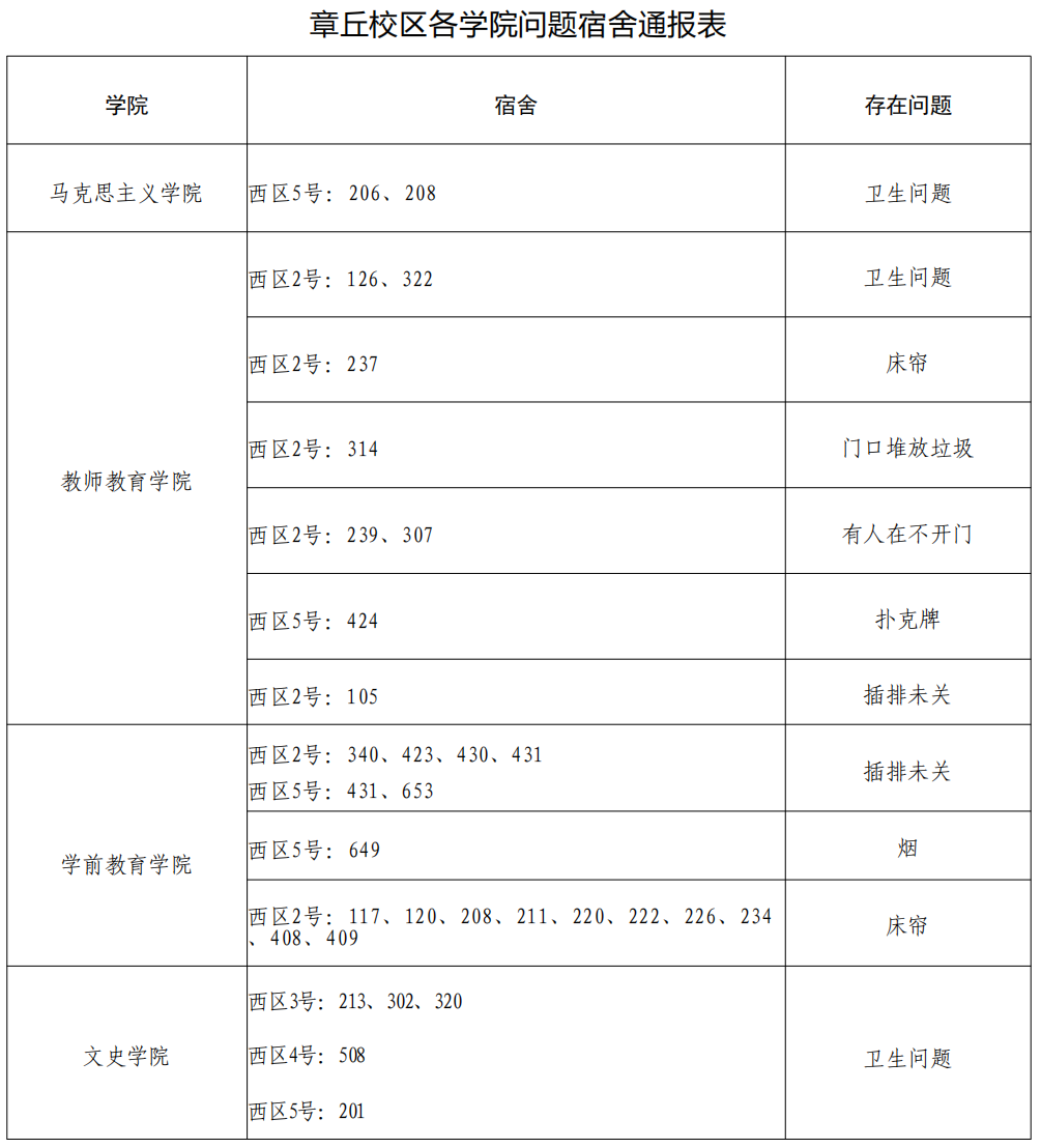 请各学院根据本周宿舍检查情况,认真整改,对问题宿舍学生进行严肃批评教育,对于学生违纪情况,落实好责任人并根据《齐鲁师范学院学生违纪处分规定》严肃处理,处理意见于3月20日下午16:00前交至学生工作部(处)学生公寓管理服务中心报备。