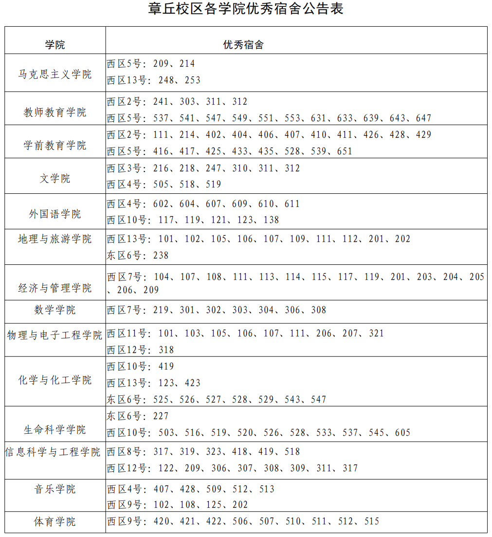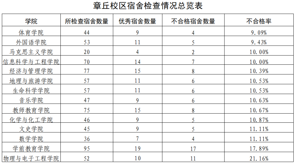 在本周学生宿舍集中大检查中,学生公寓管理服务中心按照《齐鲁师范学院学生公寓管理规定》、《齐鲁师范学院学生公寓卫生管理标准实施细则》等文件要求,对章丘校区774间宿舍进行检查,评出优秀宿舍153间,不合格宿舍94间。现公告如下: