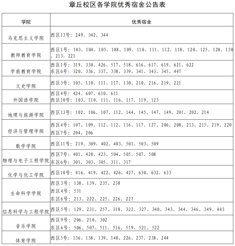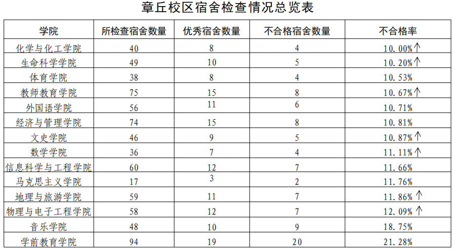 在本周学生宿舍集中大检查中,学生公寓管理服务中心按照《齐鲁师范学院学生公寓管理规定》、《齐鲁师范学院学生公寓卫生管理标准实施细则》等文件要求,对章丘校区 750 间宿舍进行检查,评出优秀宿舍150 间,不合格宿舍 96 间。现公告如下:
