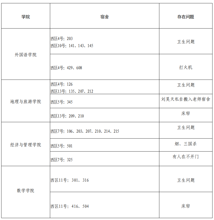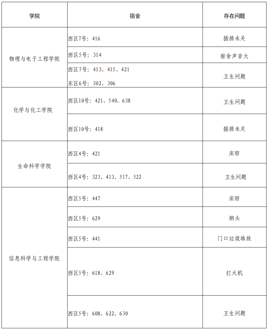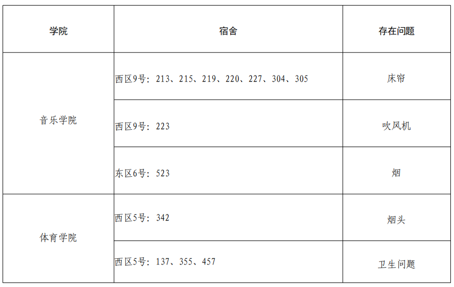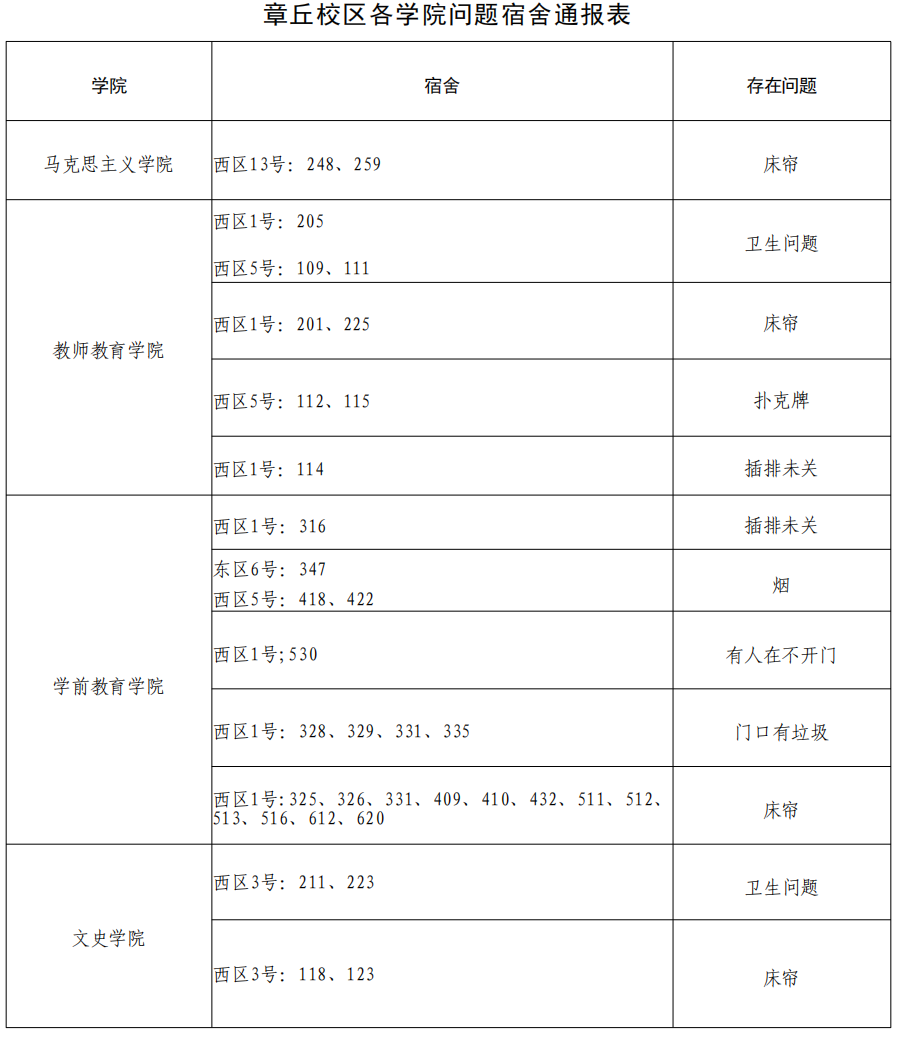 请各学院根据本周宿舍检查情况,认真整改,对问题宿舍学生进行严肃批评教育,对于学生违纪情况,落实好责任人并根据《齐鲁师范学院学生违纪处分规定》严肃处理,处理意见于 3 月 27 日下午 16:00 前交至学生工作部(处)学生公寓管理服务中心报备。
