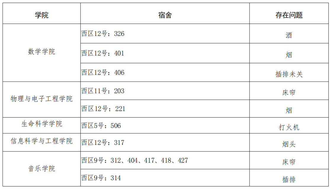 请各学院根据本周宿舍检查情况,认真整改,对问题宿舍学生进行严肃批评教育,对于学生违纪情况,落实好责任人并根据《齐鲁师范学院学生违纪处分规定》严肃处理,处理意见于 4 月 3 日下午 16:00 前交至学生工作部(处)学生公寓管理服务中心报备。
