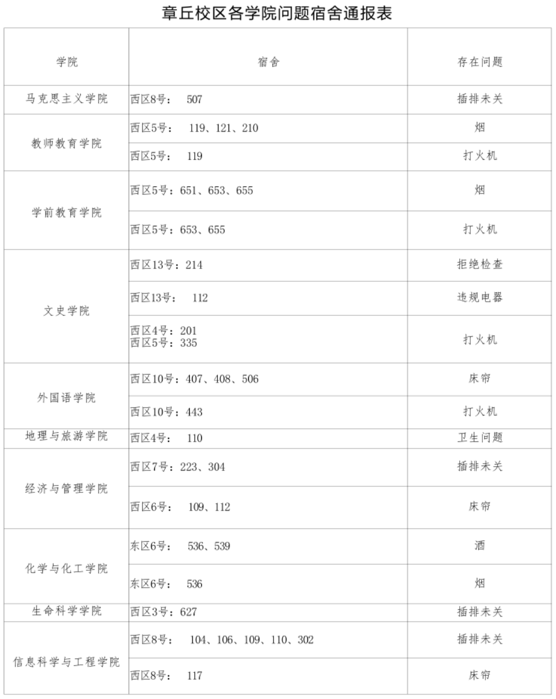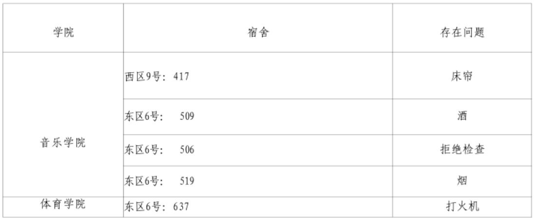 请各学院根据本周宿舍检查情况,认真整改,对问题宿舍学生进行严肃批评教育,对于学生违纪情况,落实好责任人并根据《齐鲁师范学院学生违纪处分规定》严肃处理,处理意见于 5 月 15 日下午 16:00 前交至学生工作部(处)学生公寓管理服务中心报备。
