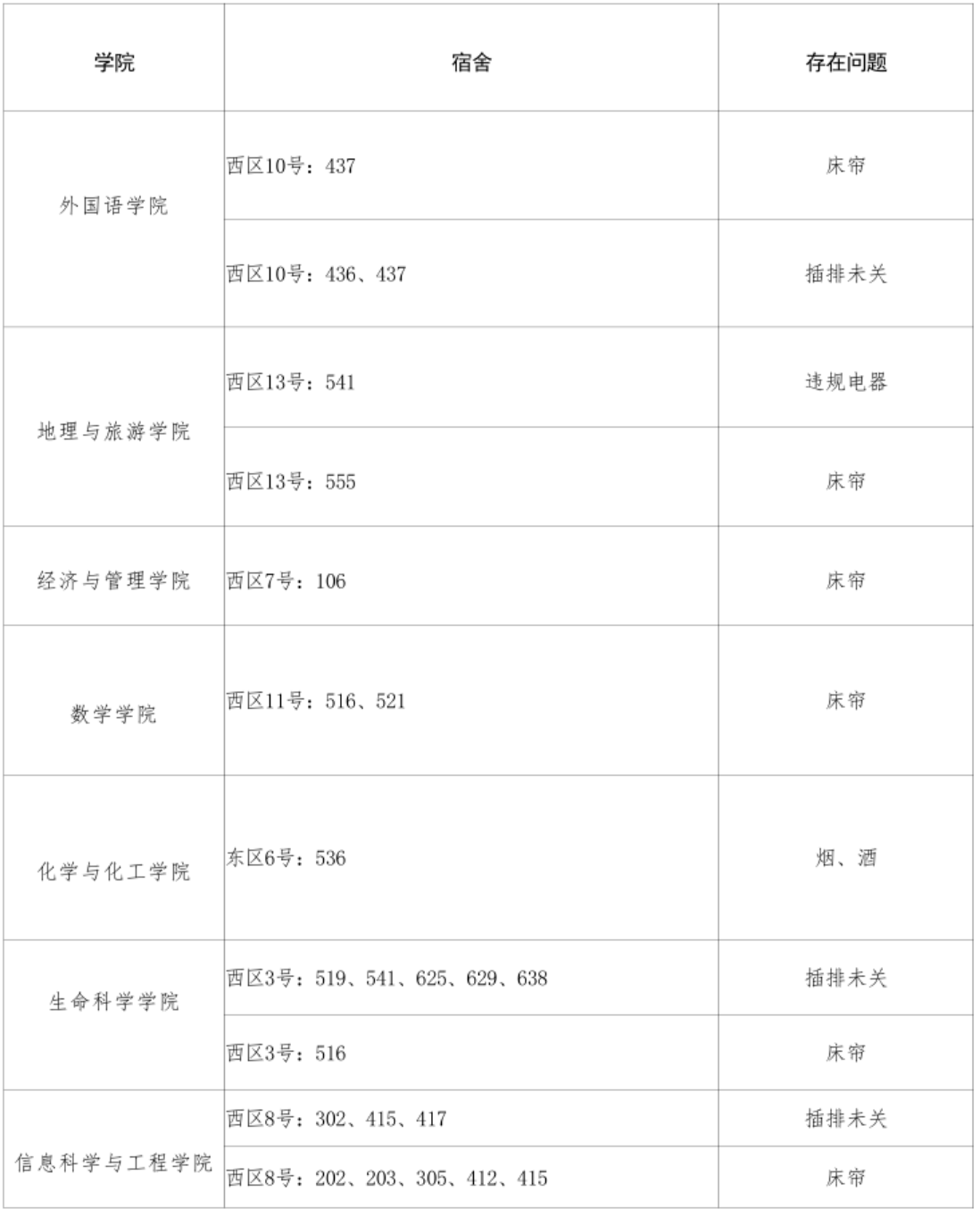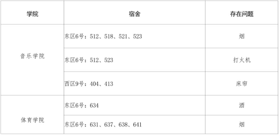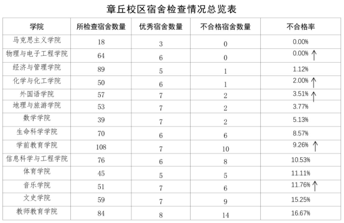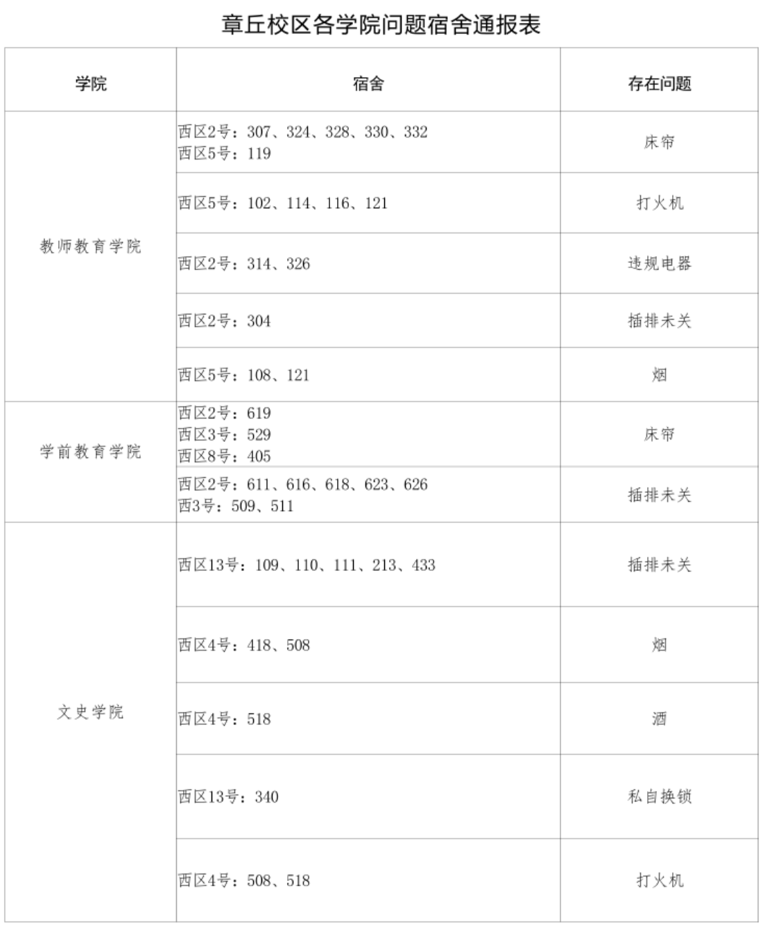 请各学院根据本周宿舍检查情况,认真整改,对问题宿舍学生进行严肃批评教育,对于学生违纪情况,落实好责任人并根据《齐鲁师范学院学生违纪处分规定》严肃处理,处理意见于 6 月 5 日下午 16:00 前交至学生工作部(处)学生公寓管理服务中心报备。