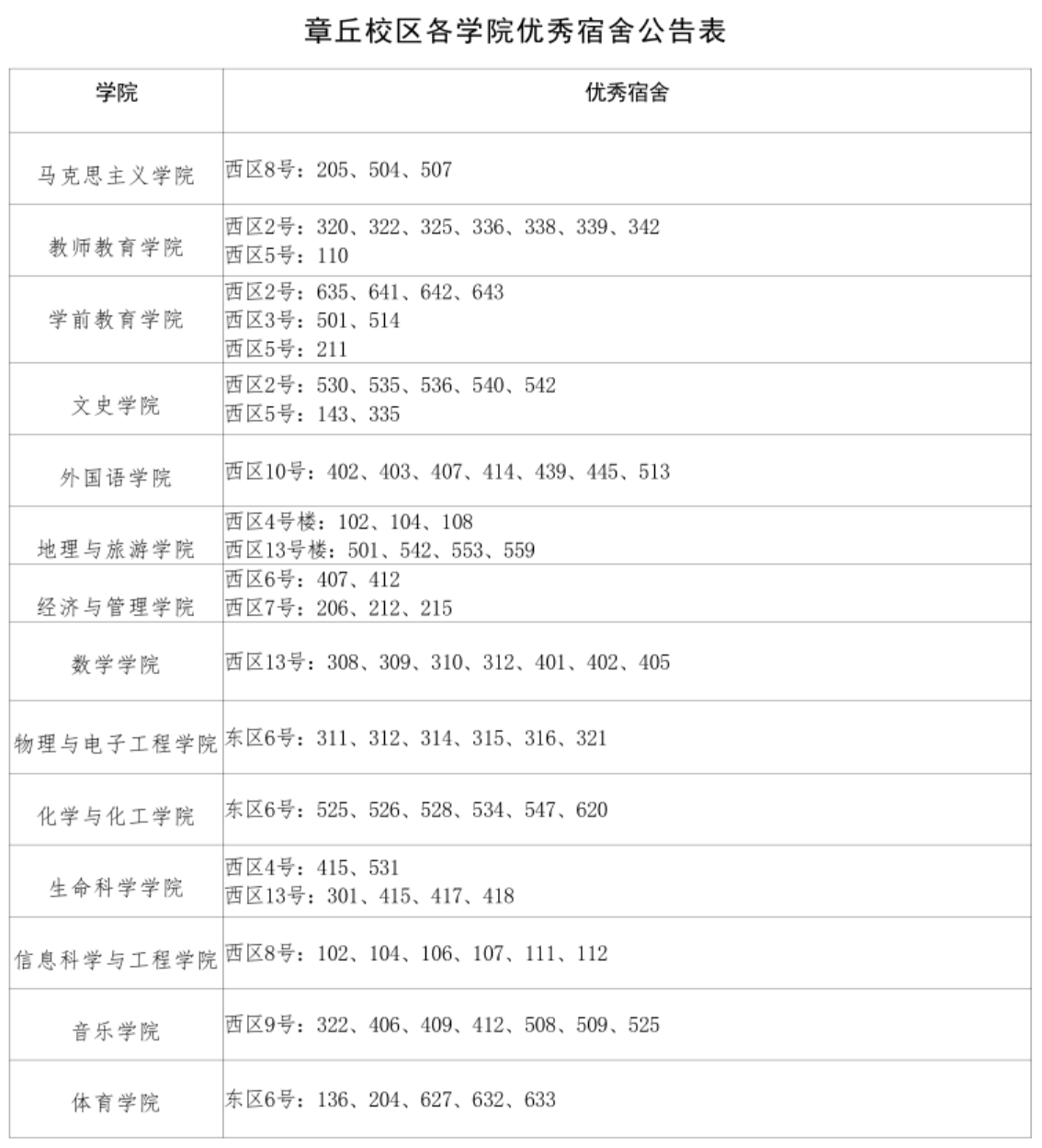 在本周学生宿舍集中大检查中,学生公寓管理服务中心按照《齐鲁师范学院学生公寓管理规定》、《齐鲁师范学院学生公寓卫生管理标准实施细则》等文件要求,对章丘校区863间宿舍进行检查,评出优秀宿舍87间,不合格宿舍66间。现公告如下: