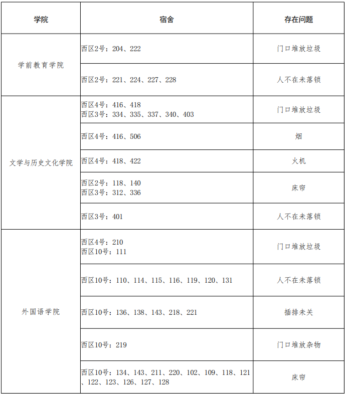 请各学院根据本周宿舍检查情况,认真整改,对问题宿舍学生进行严肃批评教育,对于学生违纪情况,落实好责任人并根据《齐鲁师范学院学生违纪处分规定》严肃处理,处理意见于 3 月 13 日下午 16:00 前交至学生工作部(处)学生管理中心报备。
