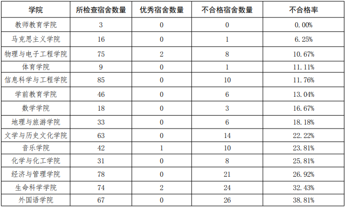 在本周学生宿舍集中大检查中,学生管理中心按照《齐鲁师范学院学生公寓管理规定》《齐鲁师范学院学生公寓卫生管理标准实施细则》等文件要求,对章丘校区640间宿舍进行检查,评出优秀宿舍5间,不合格宿舍138间。