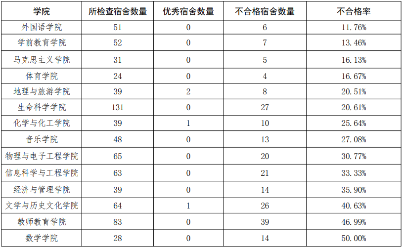 在本周学生宿舍集中大检查中,学生管理中心按照《齐鲁师范学院学生公寓管理规定》《齐鲁师范学院学生公寓卫生管理标准实施细则》等文件要求,对章丘校区757间宿舍进行检查,评出优秀宿舍4间,不合格宿舍214间。