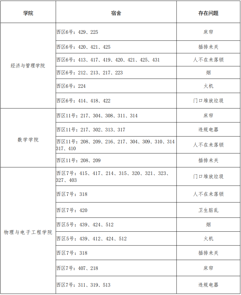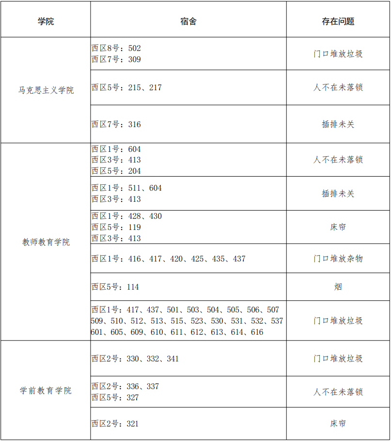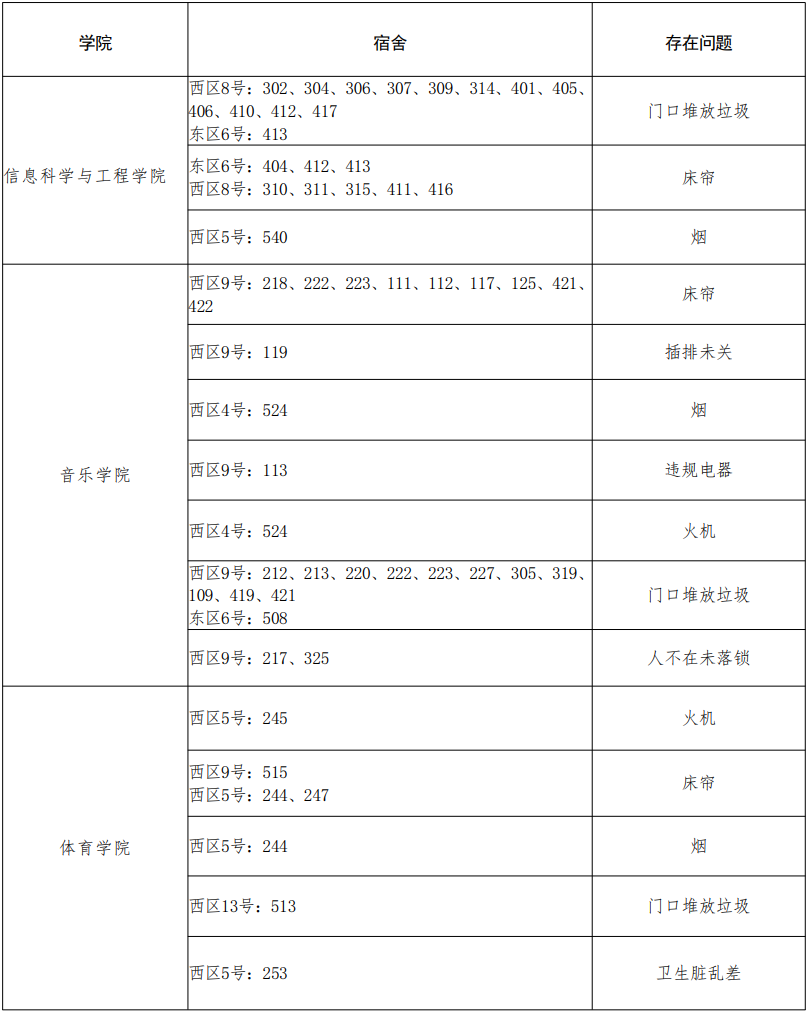 请各学院根据本周宿舍检查情况,认真整改,对问题宿舍学生进行严肃批评教育,对于学生违纪情况,落实好责任人并根据《齐鲁师范学院学生违纪处分规定》严肃处理,处理意见于 12 月 19 日下午 16:00 前交至学生工作部(处)学生管理中心报备。