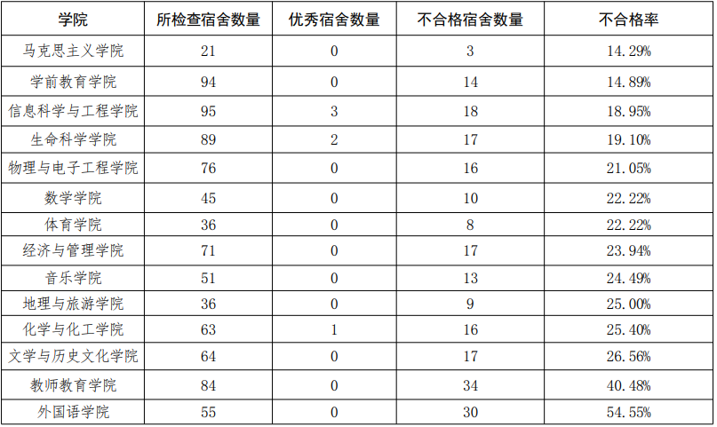 在本周学生宿舍集中大检查中,学生管理中心按照《齐鲁师范学院学生公寓管理规定》《齐鲁师范学院学生公寓卫生管理标准实施细则》等文件要求,对章丘校区880间全体宿舍进行检查,评出优秀宿舍6间,不合格宿舍222间。