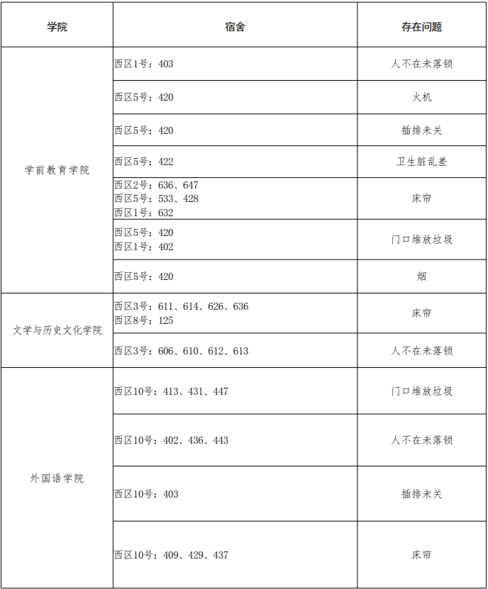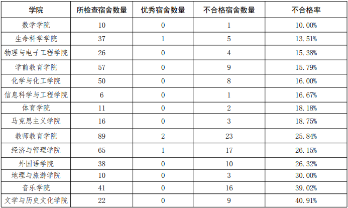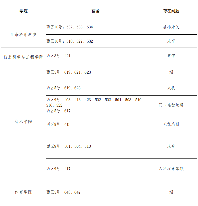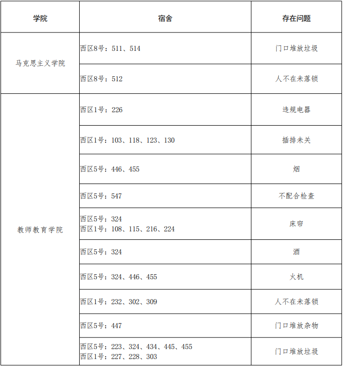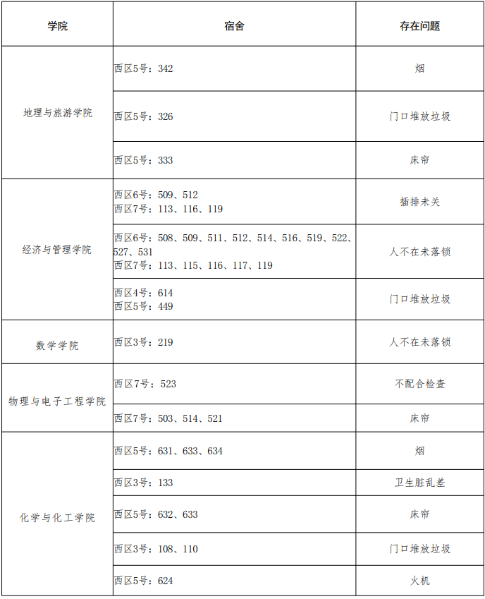 请各学院根据本周宿舍检查情况,认真整改,对问题宿舍学生进行严肃批评教育,对于学生违纪情况,落实好责任人并根据《齐鲁师范学院学生违纪处分规定》严肃处理,处理意见于 4 月 3 日下午 16:00 前交至学生工作部(处)学生管理中心报备。