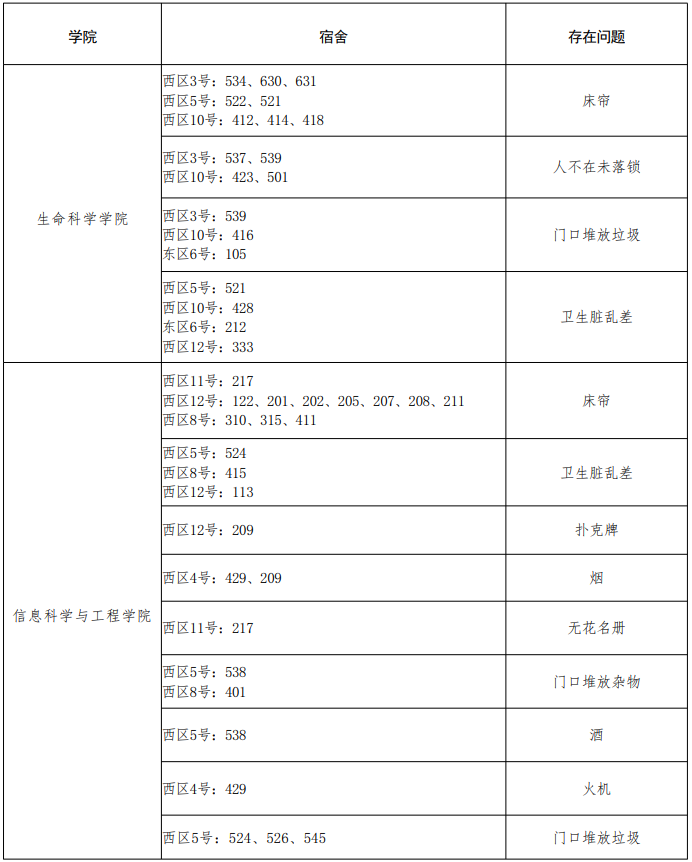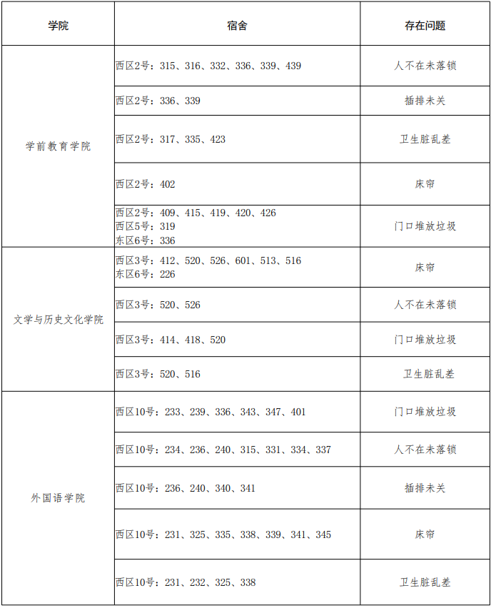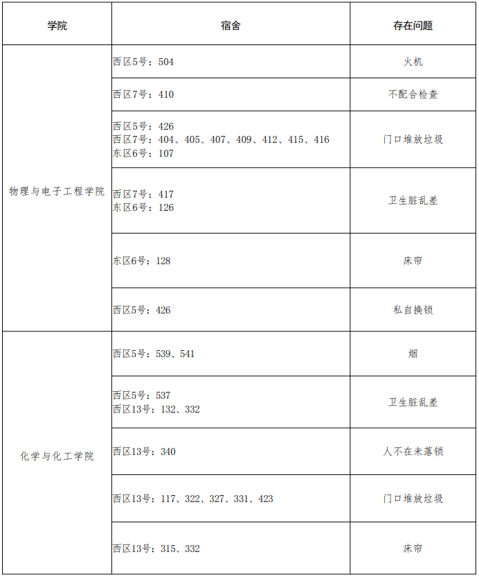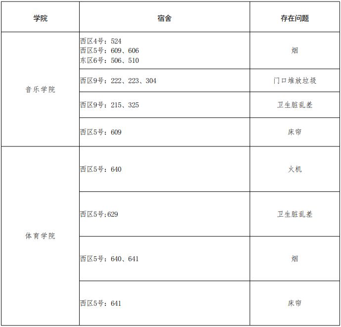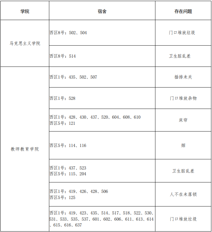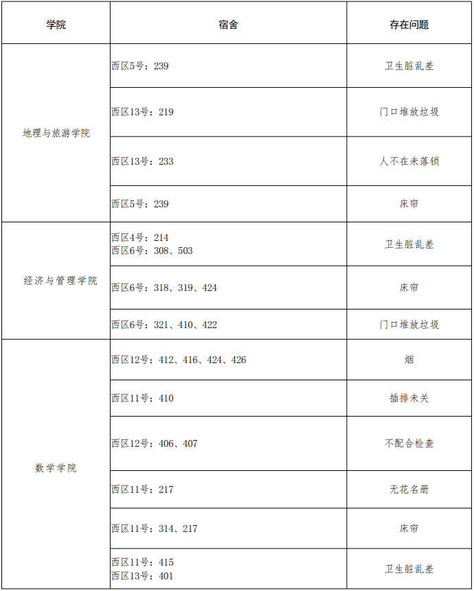请各学院根据本周宿舍检查情况,认真整改,对问题宿舍学生进行严肃批评教育,对于学生违纪情况,落实好责任人并根据《齐鲁师范学院学生违纪处分规定》严肃处理,处理意见于 4 月 17 日下午 16:00 前交至学生工作部(处)学生管理中心报备。