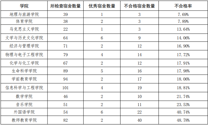 在本周学生宿舍集中大检查中,学生管理中心按照《齐鲁师范学院学生公寓管理规定》《齐鲁师范学院学生公寓卫生管理标准实施细则》等文件要求,对章丘校区897间全体宿舍进行检查,评出优秀宿舍41间,不合格宿舍191间。