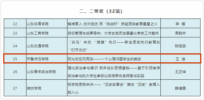 近日,由山东省委教育工委组织开展的全省高校辅导员2020年度优秀工作案例评选结果揭晓,我校教师教育学院辅导员王迪撰写的《阳光总在风雨后——一个心理问题学生的蜕变》工作案例荣获二等奖,信息科学与工程学院辅导员孙亚楠撰写的《送你一朵小红花——记一个学业预警学生的“逆袭”》工作案例荣获三等奖。