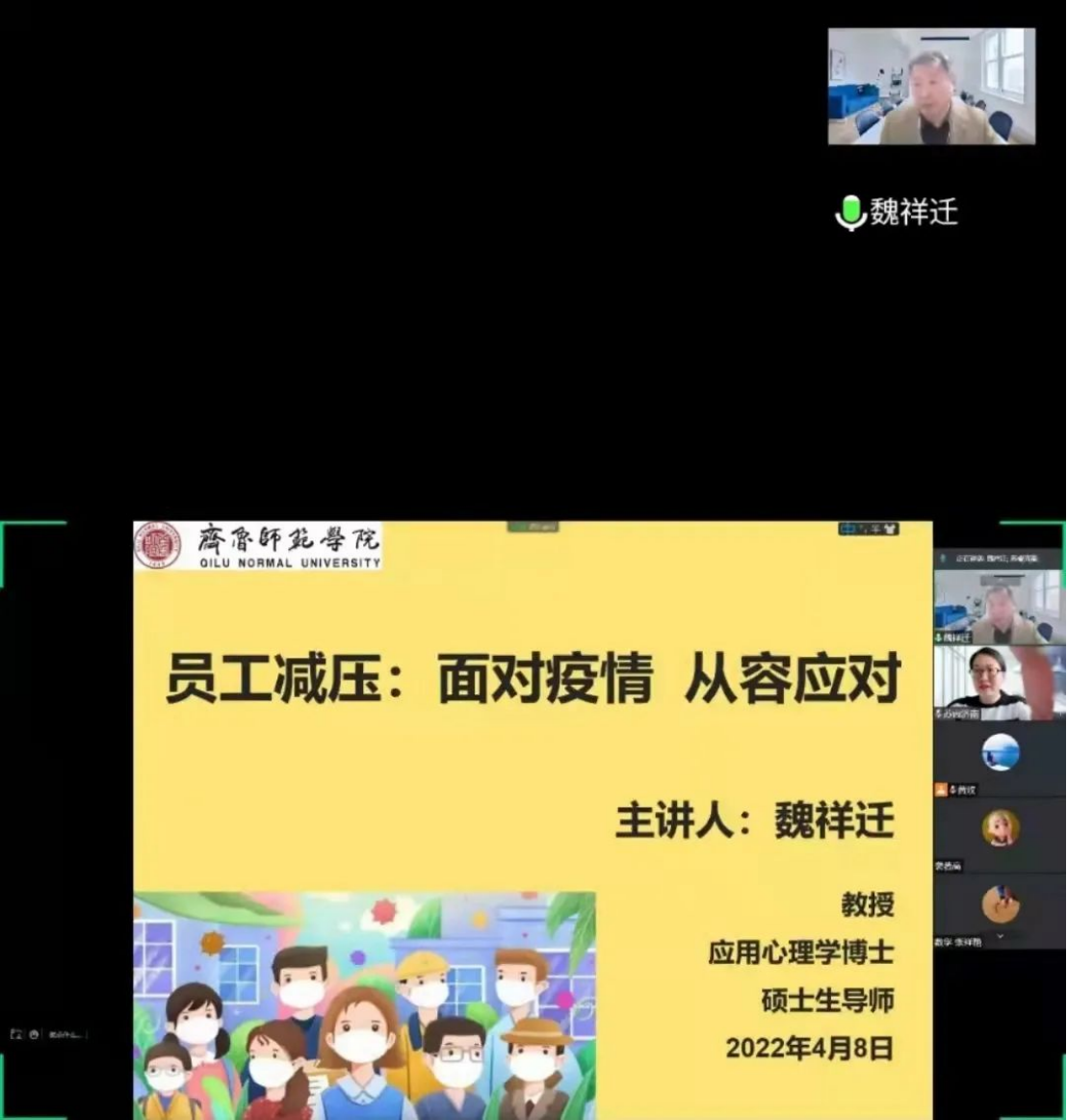 为贯彻落实《山东省教育厅新冠肺炎疫情处置工作领导小组关于做好当前疫情形势下学生心理健康教育工作的通知》文件精神,结合《疫情防控下学生心理健康工作方案》内容,为帮助我校教师更好的做好疫情期间的心理调适,缓解心理压力,学会梳理情绪,树立阳光心态,提高心理健康水平。4月8日下午三点,我校举办了疫情期间心理健康系列云讲座之二——“面对疫情,从容应对,教师减压心理讲座”。各学院党委副书记,团总支书记、副书记,辅导员在线聆听了讲座。