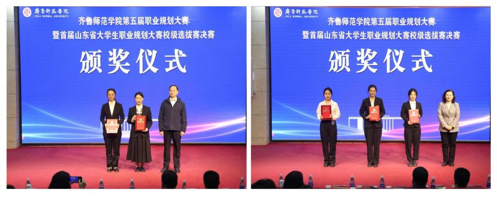 大赛特邀齐鲁工业大学政法学院党委副书记兼纪委书记、大学生职业发展工作室副主任娄峰,山东大智控股集团股份有限公司人力资源负责人孙玲玲,山东福胶集团组织发展部部长张彦隆,济南深泉外国语学校党政办副主任张玉梅,山东创谷园区运营管理有限公司总经理王颖担任评委。李吉祥、赵敏为评委颁发了“齐鲁师范学院大学生职业生涯规划导师”聘任书。