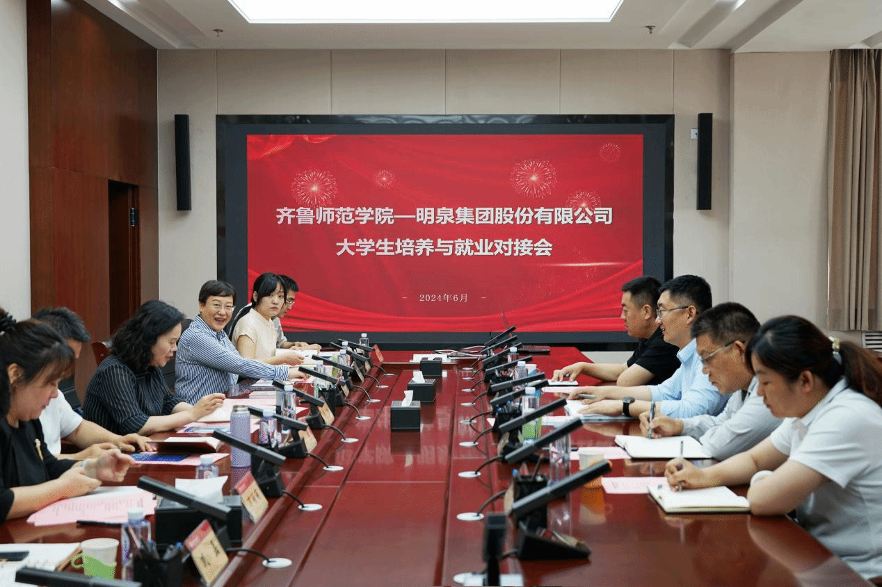 为深化校企深层次合作,促进大学生高质量就业,6月6日,齐鲁师范学院与明泉集团股份有限公司(以下简称明泉集团)共同举办大学生培养与就业对接会。学校党委副书记赵敏,明泉集团监事、人力资源中心主任刘洋出席会议并讲话。学校相关部门负责人参加会议,活动由学生工作部(处)部长李玮主持。