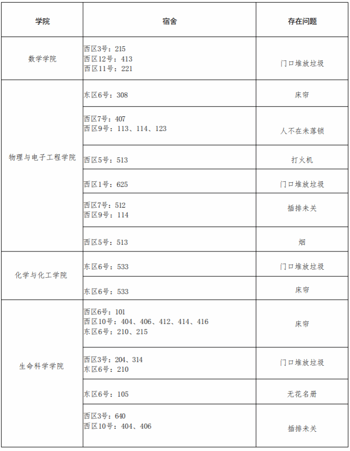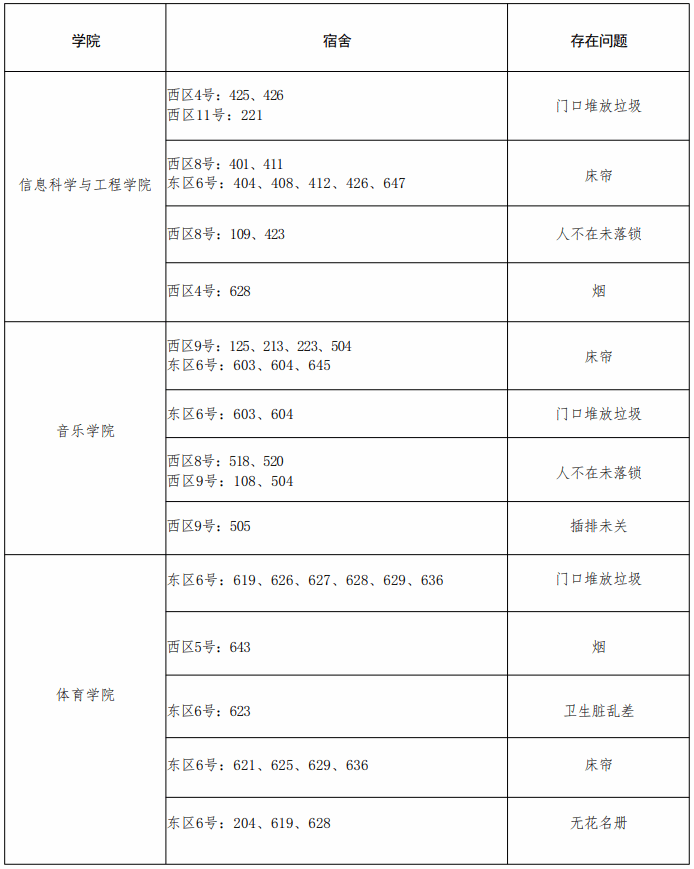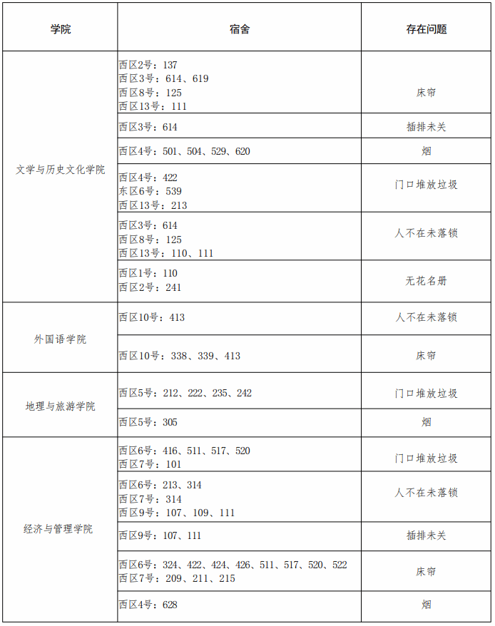 章丘校区各学院问题宿舍通报表