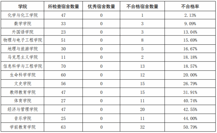 在本周学生宿舍集中大检查中,学生管理中心按照《齐鲁师范学院学生公寓管理规定》《齐鲁师范学院学生公寓卫生管理标准实施细则》等文件要求,对我校第一周大检查宿舍中的问题学生宿舍进行“回头看”检查,共计查出优秀宿舍0间,不合格宿舍151间,其余宿舍均达合格标准。