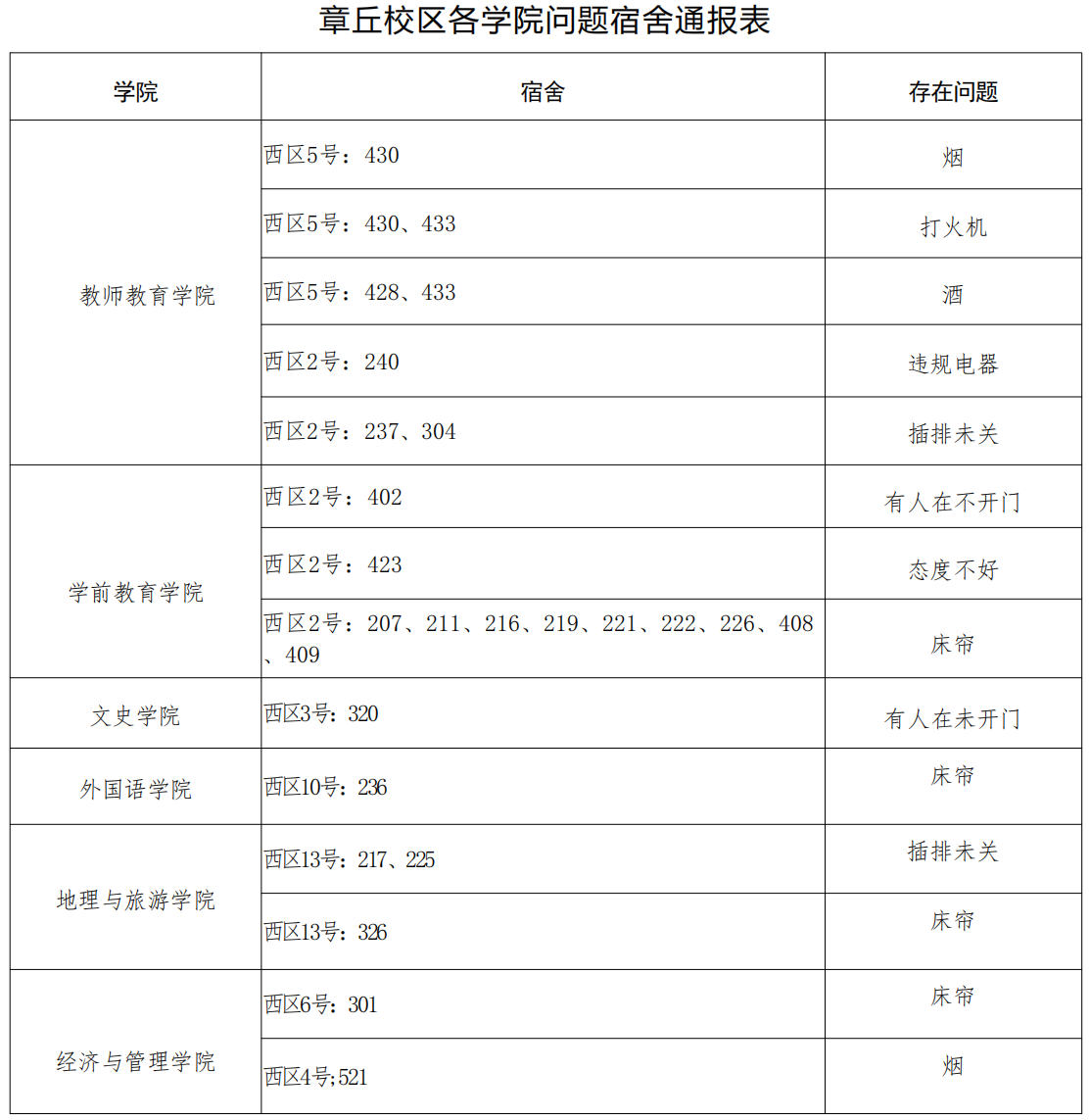 请各学院根据本周宿舍检查情况,认真整改,对问题宿舍学生进行严肃批评教育,对于学生违纪情况,落实好责任人并根据《齐鲁师范学院学生违纪处分规定》严肃处理,处理意见于 4 月 3 日下午 16:00 前交至学生工作部(处)学生公寓管理服务中心报备。