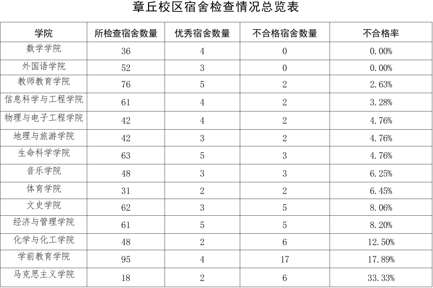 在本周学生宿舍集中大检查中,学生公寓管理服务中心按照《齐鲁师范学院学生公寓管理规定》、《齐鲁师范学院学生公寓卫生管理标准实施细则》等文件要求,对章丘校区739间宿舍进行检查,评出优秀宿舍45间,不合格宿舍55间。现公告如下: