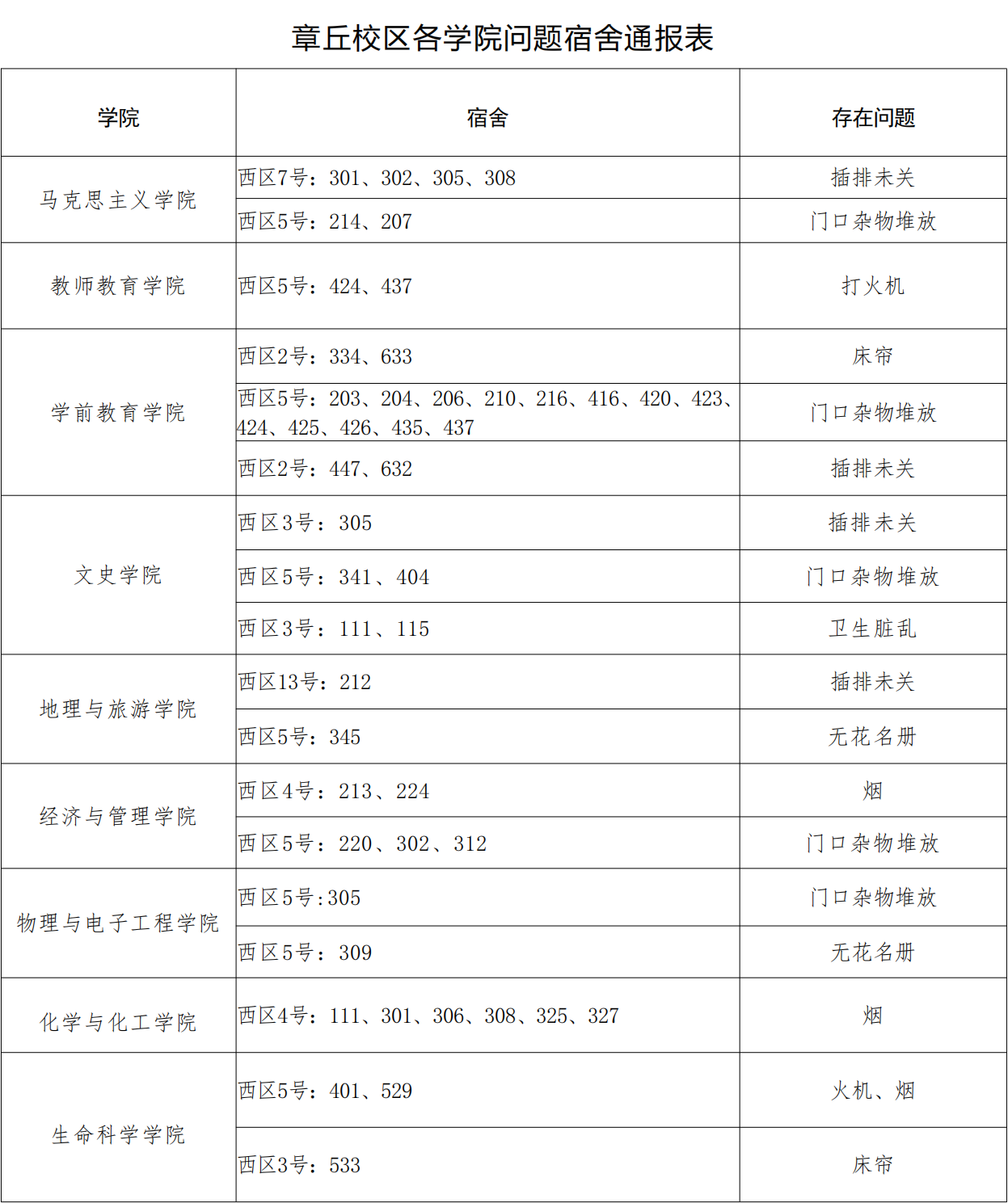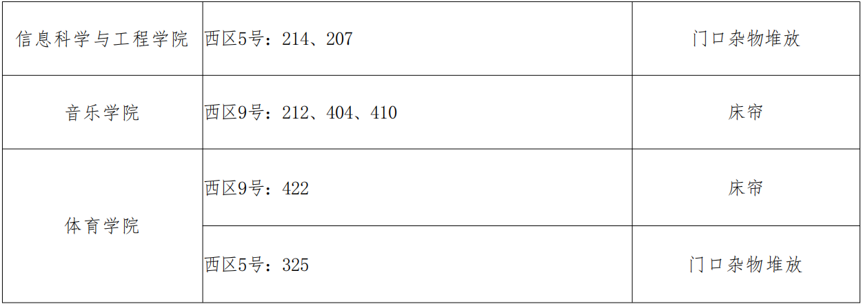 请各学院根据本周宿舍检查情况,认真整改,对问题宿舍学生进行严肃批评教育,对于学生违纪情况,落实好责任人并根据《齐鲁师范学院学生违纪处分规定》严肃处理,处理意见于 9 月 25 日下午 16:00 前交至学生工作部(处)学生管理中心报备。
