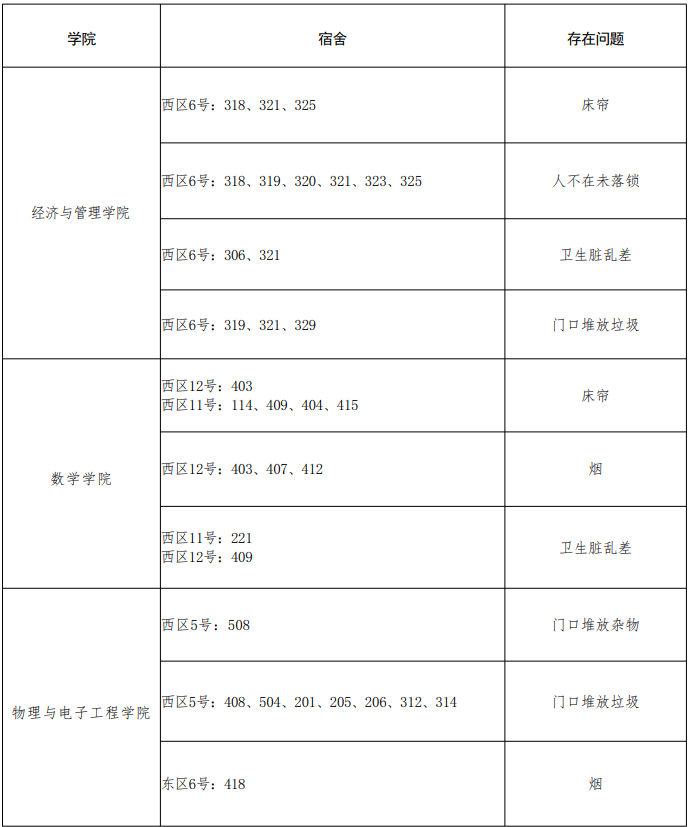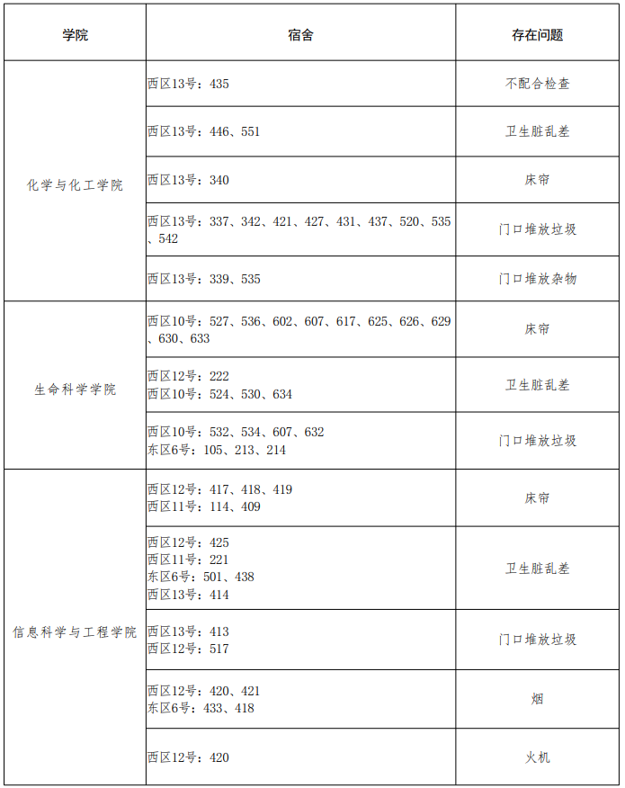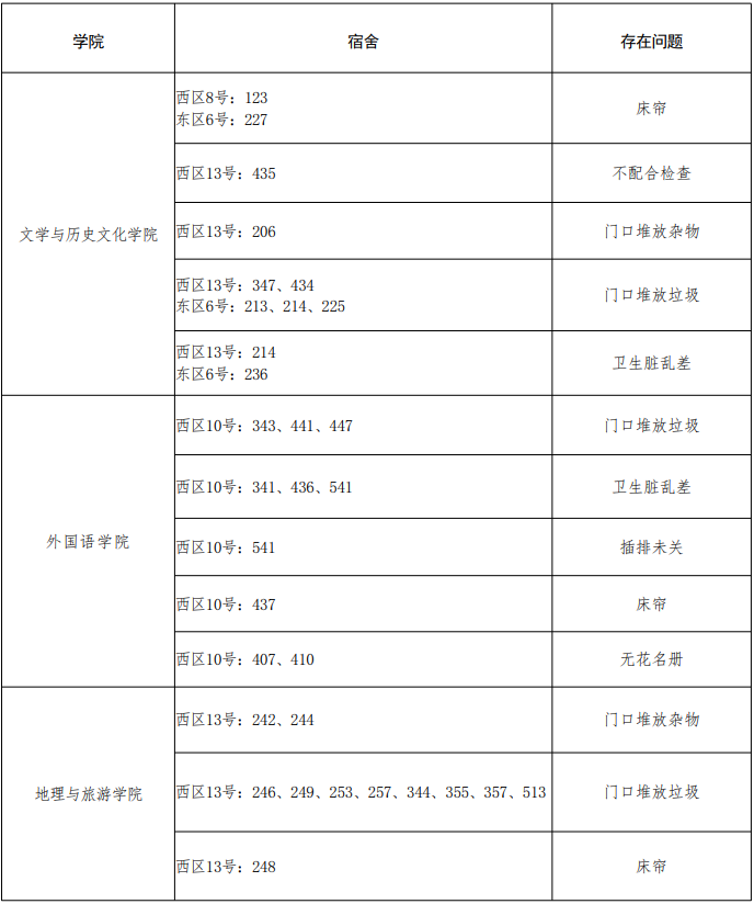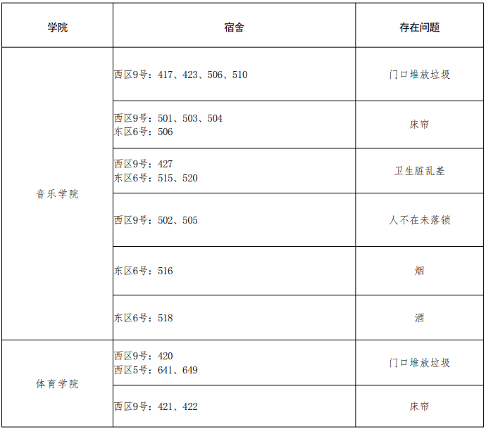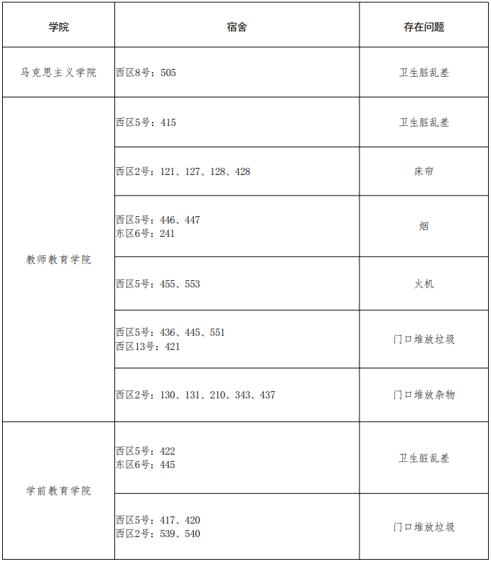 请各学院根据本周宿舍检查情况,认真整改,对问题宿舍学生进行严肃批评教育,对于学生违纪情况,落实好责任人并根据《齐鲁师范学院学生违纪处分规定》严肃处理,处理意见于 6 月 12 日下午 16:00 前交至学生工作部(处)学生管理中心报备。