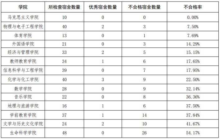 在本周学生宿舍集中大检查中,学生管理中心按照《齐鲁师范学院学生公寓管理规定》《齐鲁师范学院学生公寓卫生管理标准实施细则》等文件要求,对章丘校区405间全体宿舍进行检查,评出优秀宿舍12间,不合格宿舍107间。
