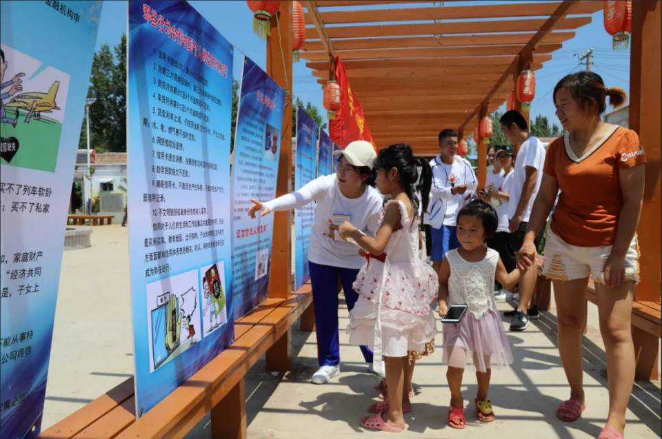 我们将小广场作为政策宣传的阵地,广场边的长廊里,关于国家资助政策、征信知识的宣传展板和横幅整齐悬挂。队员们宣传学生资助政策,并现身说法,告诉村民们不要因为家庭经济条件不好就不让孩子们读书,任何学段都有相应的资助政策,国家的政策就是“绝不让一名孩子因为家庭经济困难而失学”,只有读书才可以改变命运!