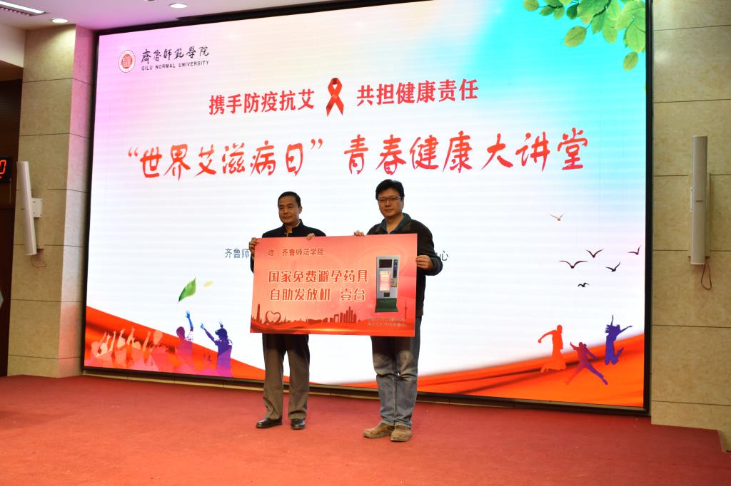 刘宝君向来宾介绍了我校青春健康教育工作开展情况,连续五年中标市级、省级、国家级青春健康高校项目,建成了一体两翼四级青春健康工作体制。随后,市卫健委党组副书记、市计生协常务副会长庞涛讲话。他高度评价了我校青春健康教育工作,并希望借此机会调动广大青年学生的积极性,为中国青春健康教育作出更多贡献。活动中,济南市计划生育协会、济南市计划生育服务中心向我校捐赠了避孕套发放机。