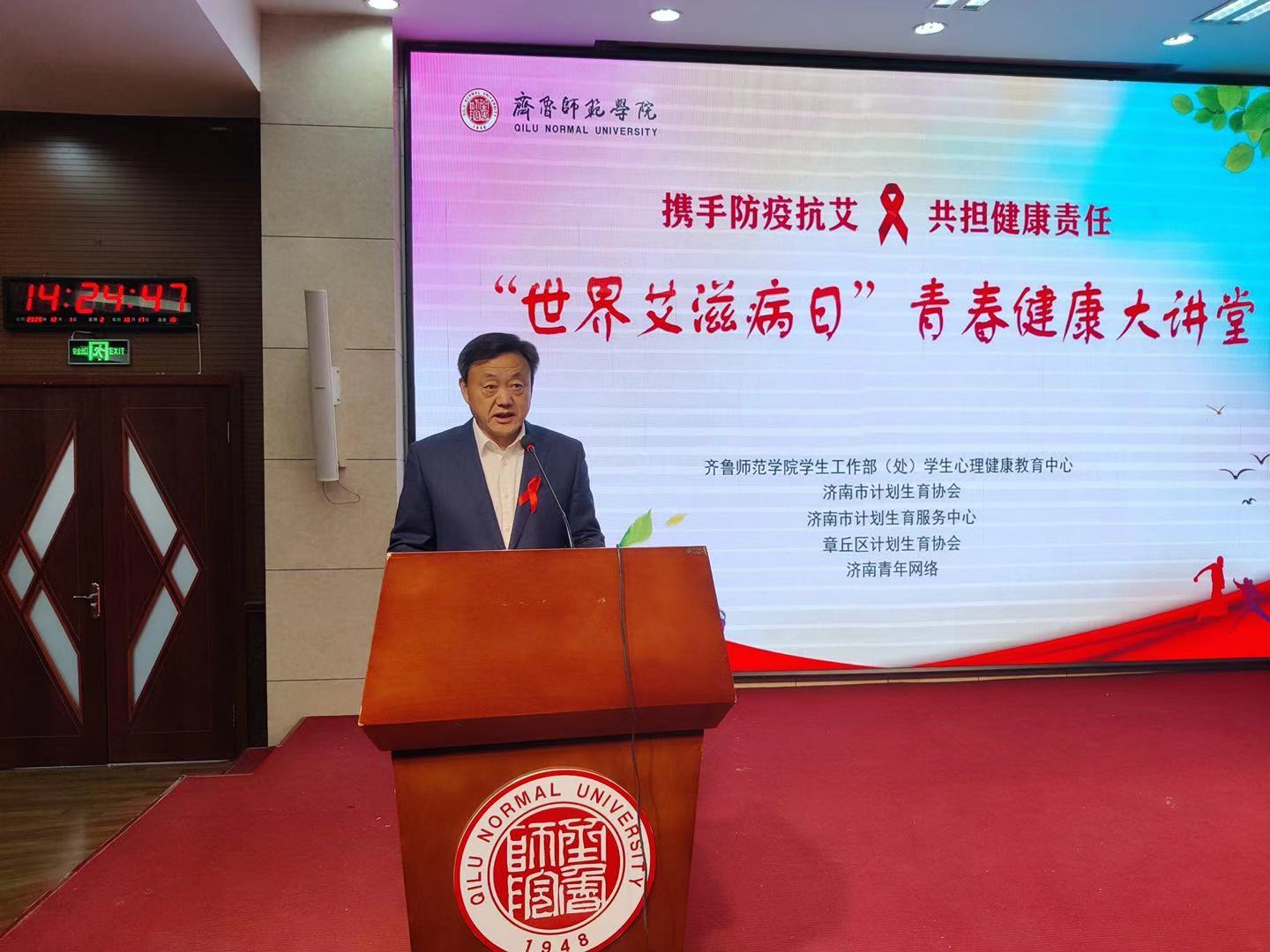 12月1日是第33个“世界艾滋病日”,齐鲁师范学院学生工作部(处)学生心理健康教育中心于12月1日下午两点在章丘校区学术报告厅举办了主题为“携手防疫抗艾,共担健康责任”的“世界艾滋病日”青春健康大讲堂活动。济南市卫健委党组副书记、市计生协常务副会长庞涛、市计生协副会长赵莹和济南市计生协、章丘区计生协相关领导应邀参加,我校党委副书记刘宝君、学生工作部(处)有关负责人,及各学院团总支书记、辅导员、学生代表们参加了此次活动。
