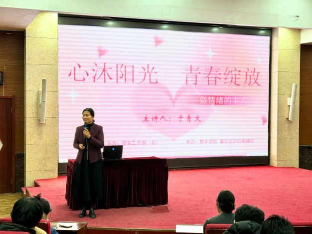 为深入贯彻落实学生全面发展理念,引导学生关注自身心灵与身体的成长,营造积极向上、健康和谐的校园氛围,12月24日下午,由学生工作部(处)主办、数学学院承办的以“心沐阳光 青春绽放”为主题的心理健康与青春期生理健康教育专题讲座于章丘校区第一学术报告厅顺利举办,特邀章丘区妇幼保健院的两位专家——于青文主任与谢玲主任为主讲嘉宾,围绕情绪管理与青春期生理健康,深入讲解相关知识。