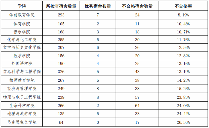在本周学生宿舍集中大检查中,学生管理中心按照《齐鲁师范学院学生公寓管理规定》《齐鲁师范学院学生公寓卫生管理标准实施细则》等文件要求,对章丘校区全体宿舍进行检查,评出优秀宿舍65间,不合格宿舍444间。
