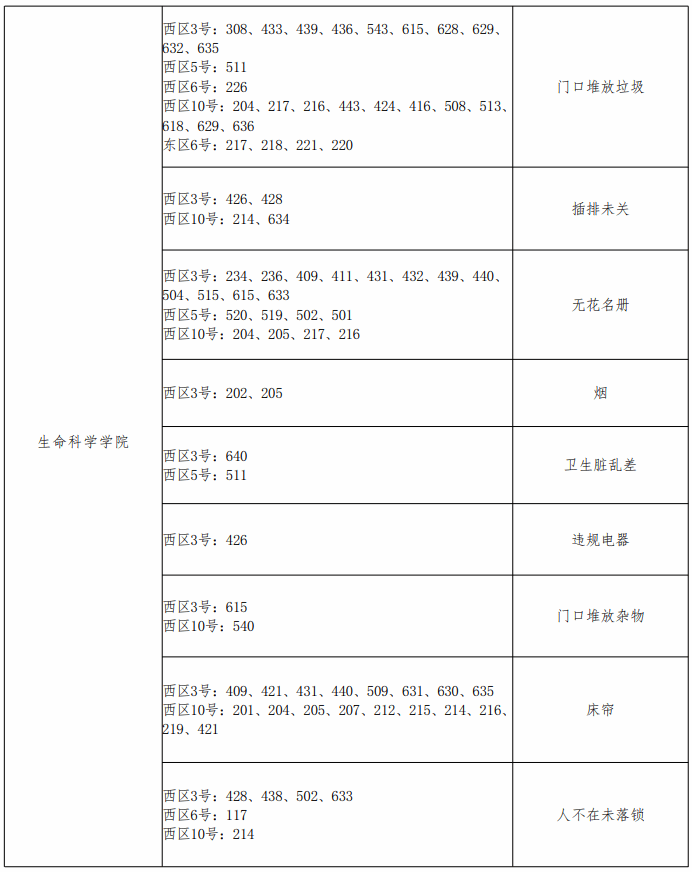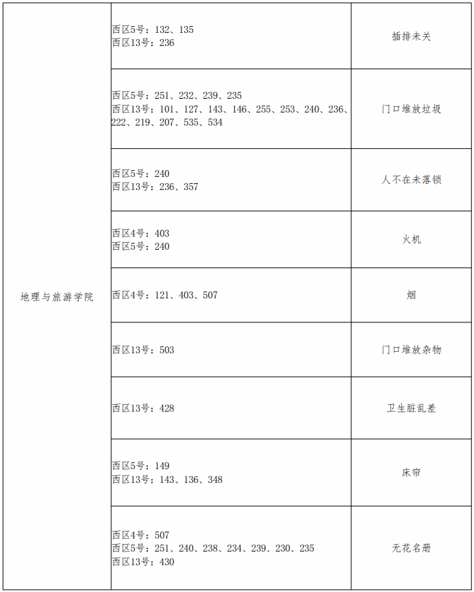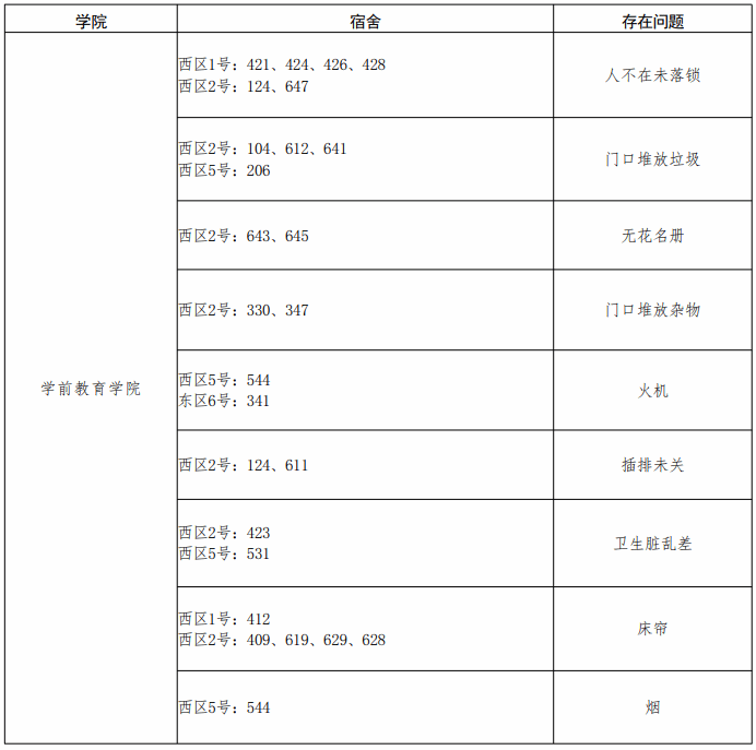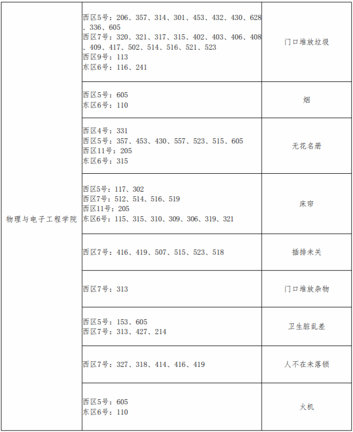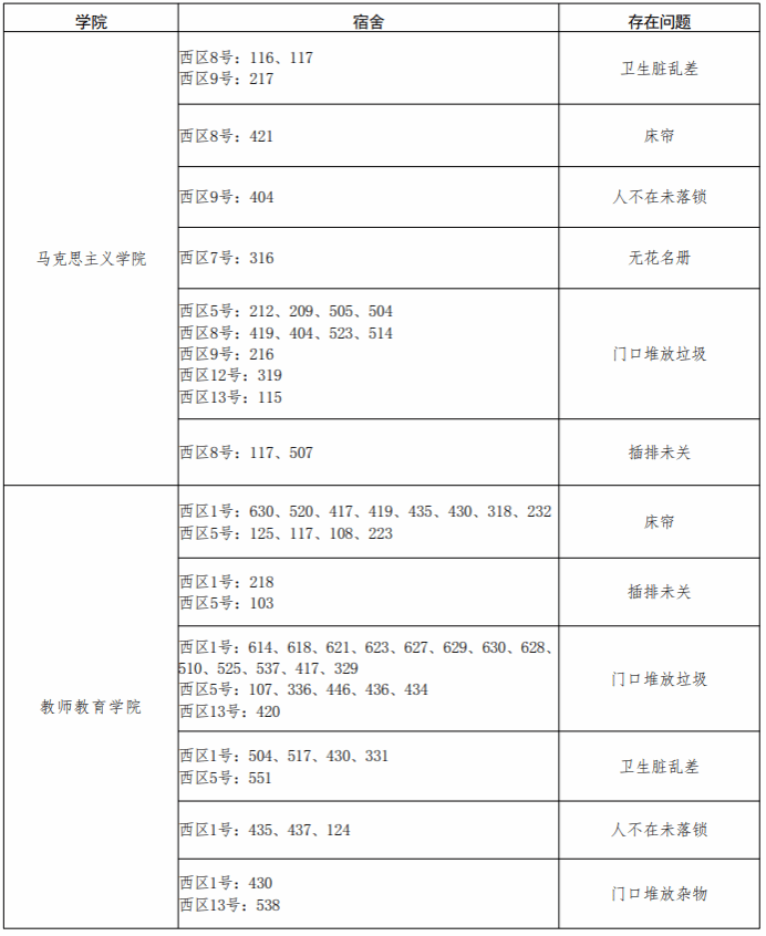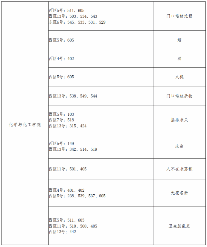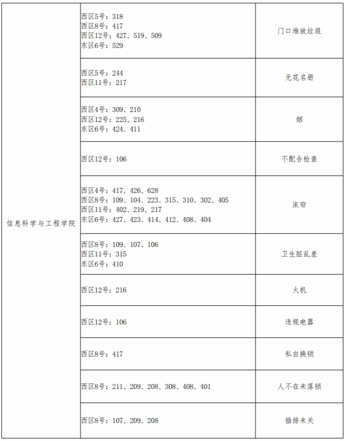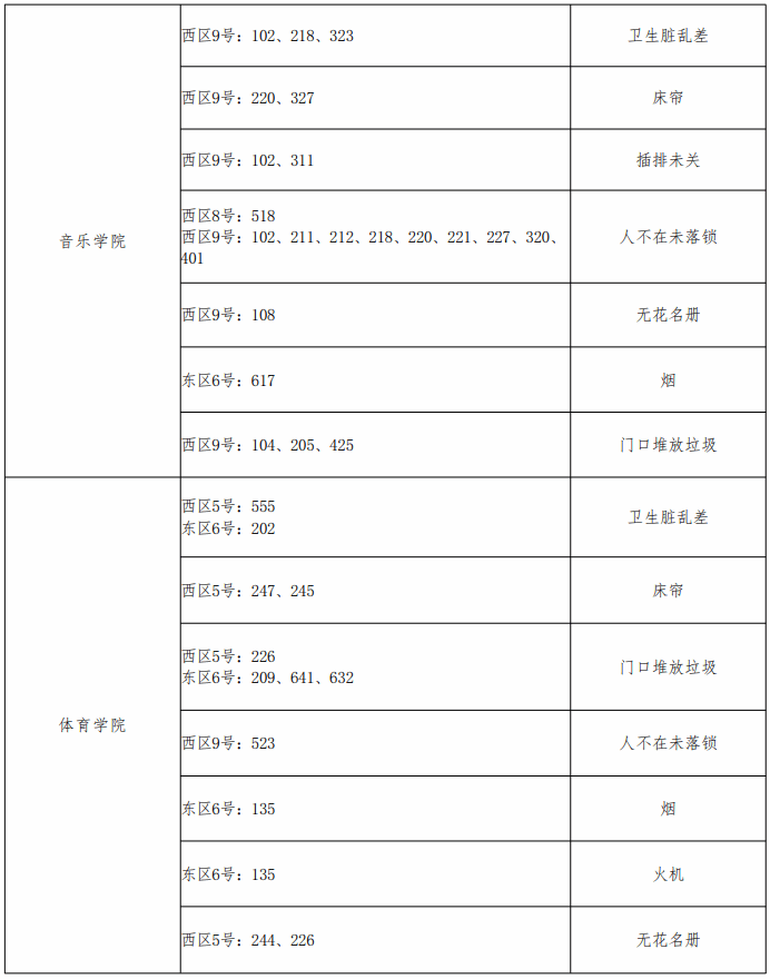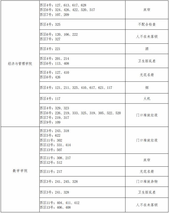 章丘校区各学院问题宿舍通报表