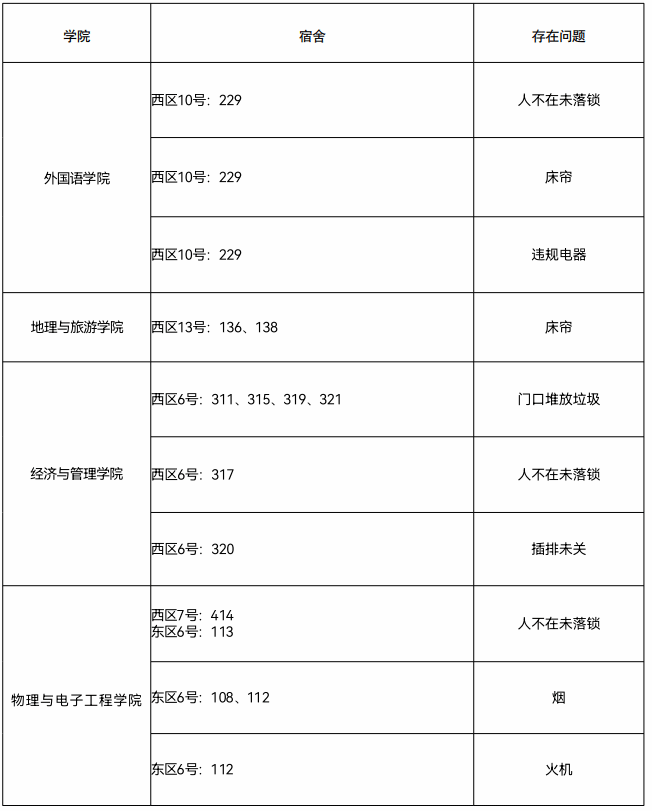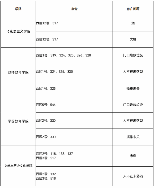 请各学院根据本周宿舍检查情况,认真整改,对问题宿舍学生进行严肃批评教育,对于学生违纪情况,落实好责任人并根据《齐鲁师范学院学生违纪处分规定》严肃处理,处理意见于4月9日下午16:00前交至学生工作处学生管理中心报备。